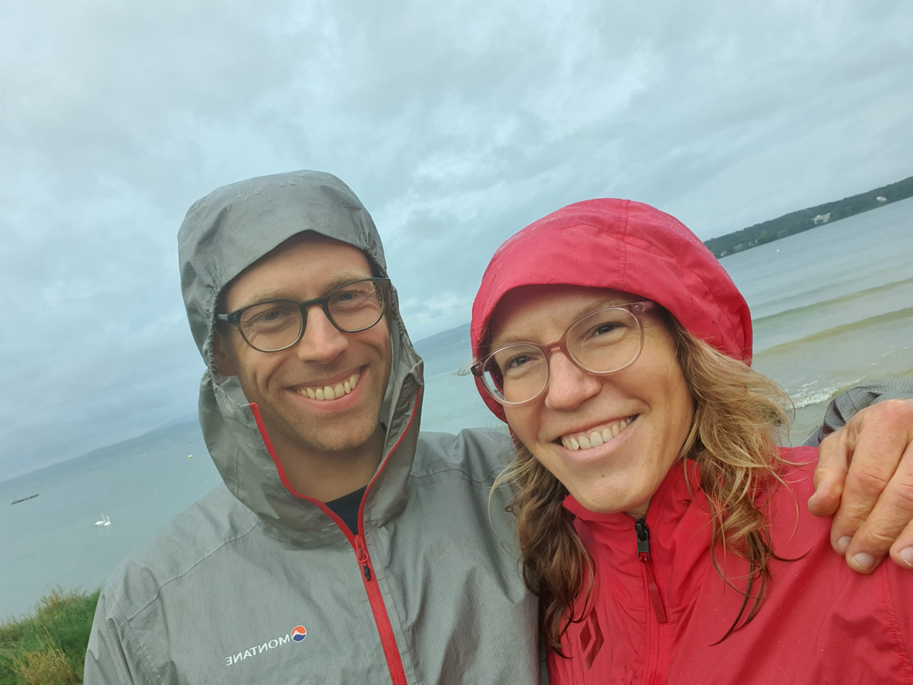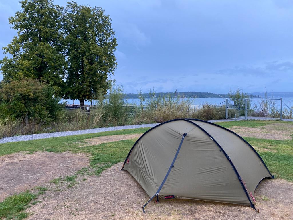 In Konstanz erwartet uns strömender Regen aber ein gemütlicher Platz direkt am Bodensee für unser Zelt.
