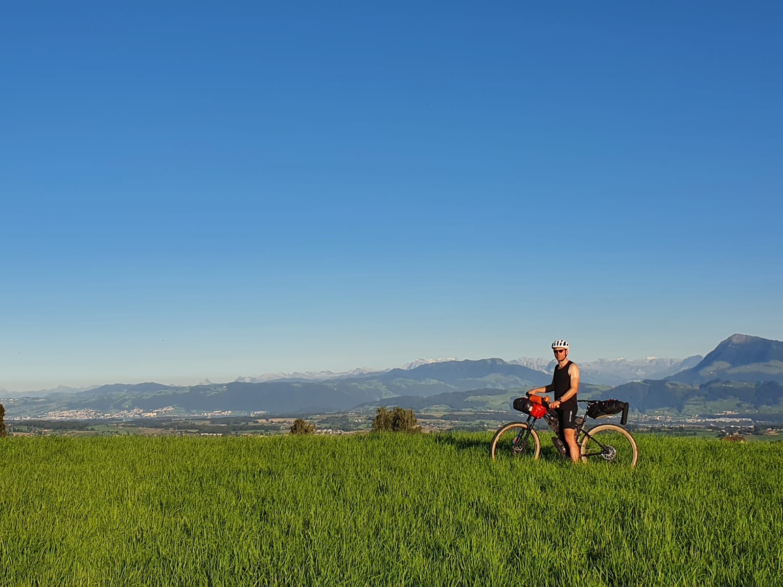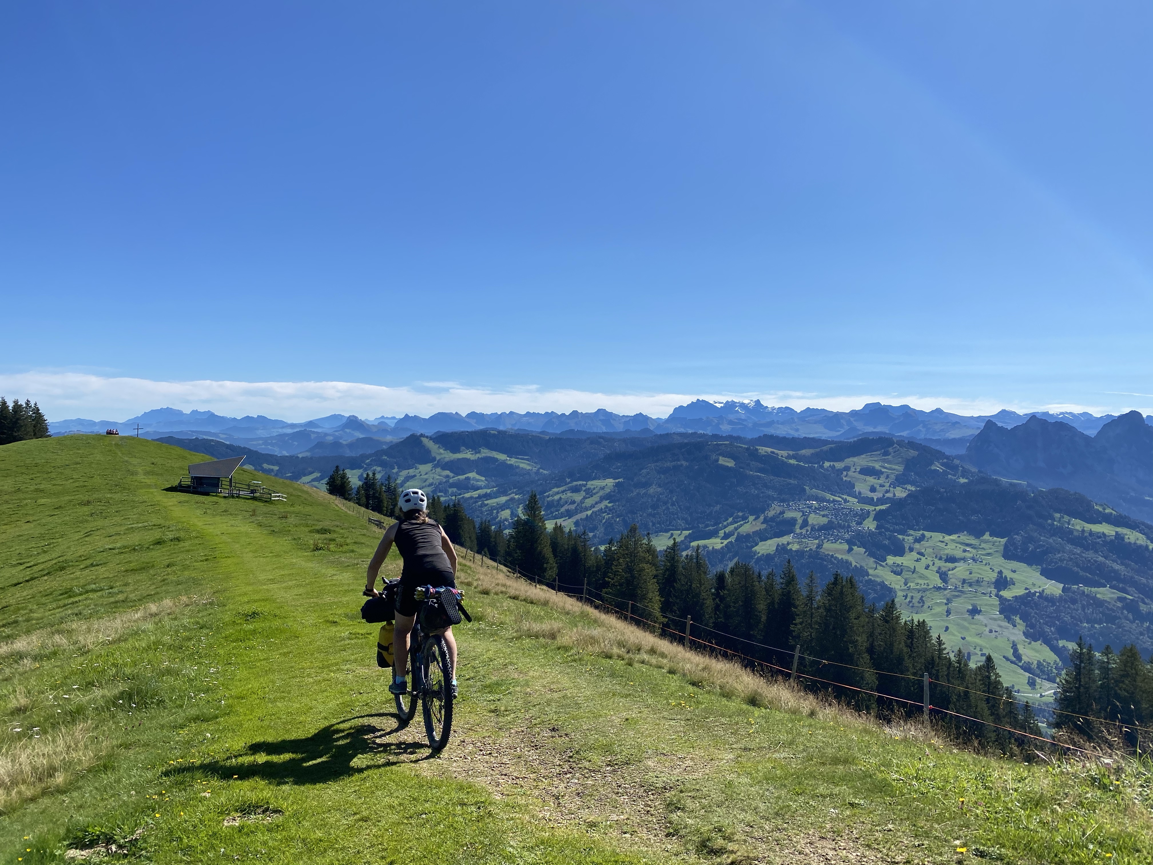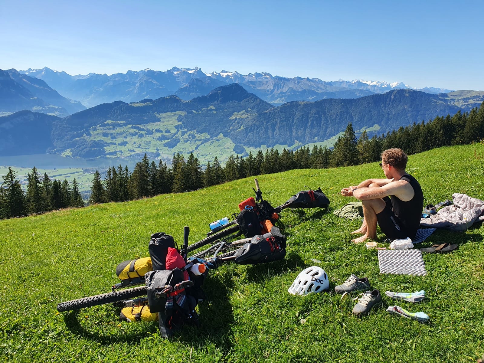 Am Gipfel angekommen ignorieren wir den Hinweis von netten schweizer Wanderern, dass man den Weg nicht radeln könne und fahren den ruppigen Trail Richtung Ägerisee ab. Auf einem Höhenweg geht es weiter zum Zugersee, wo wir wahnsinnig viele Raubvögel über uns kreisen sehen. Die Bauern haben ihre Wiesen gemäht und es duftet überall nach Heu. Wir beschließen noch eine „Flachland-Etappe“ dranzuhängen, die uns dann doch noch weitere 700 Höhenmeter einbringt. Wirklich flach ist hier eben nichts. Müde und zufrieden erreichen wir unser Ziel, den Campingplatz am Sempachersee. Heute schmeckt die Pasta auf jeden Fall besonders gut.