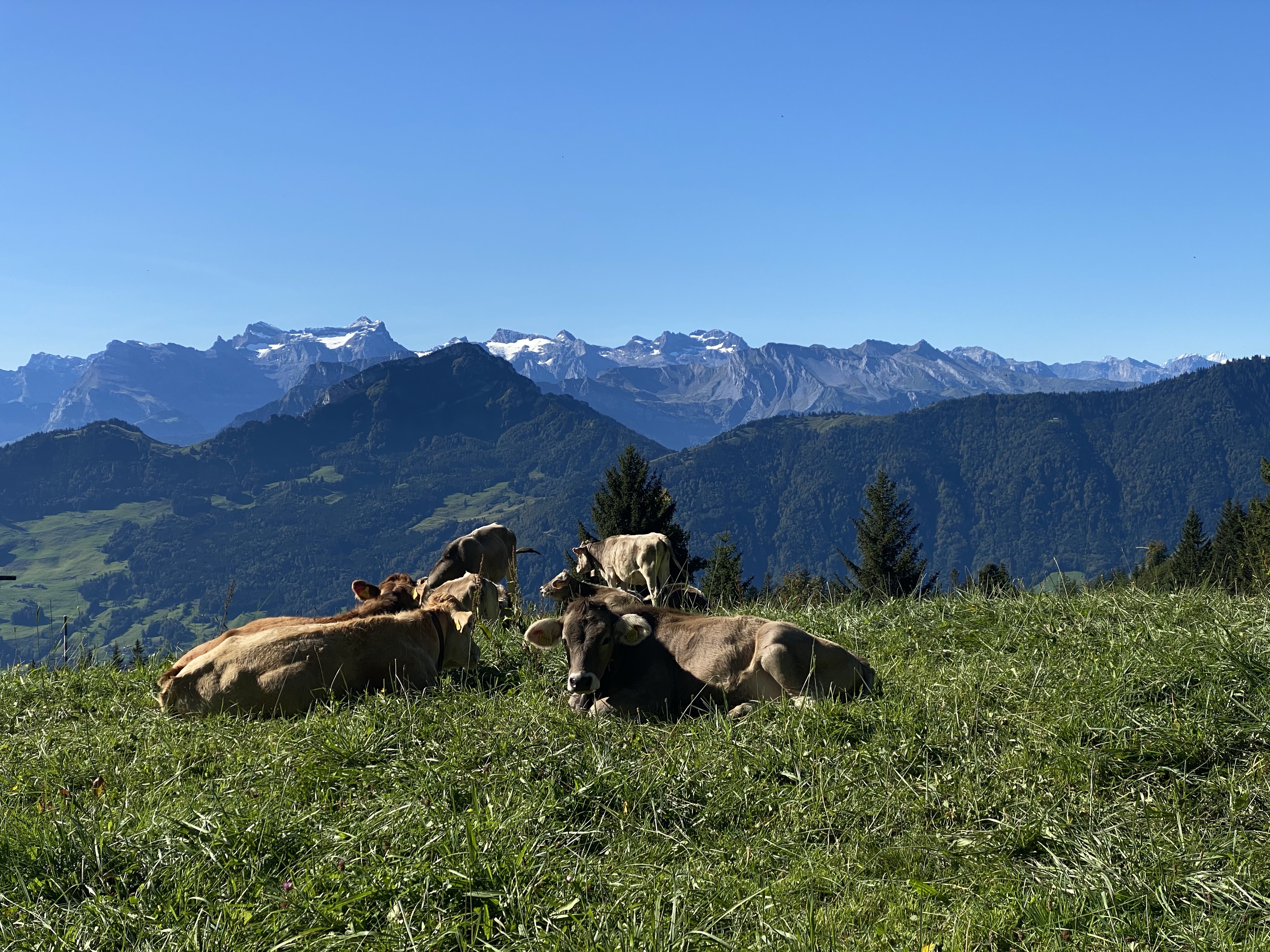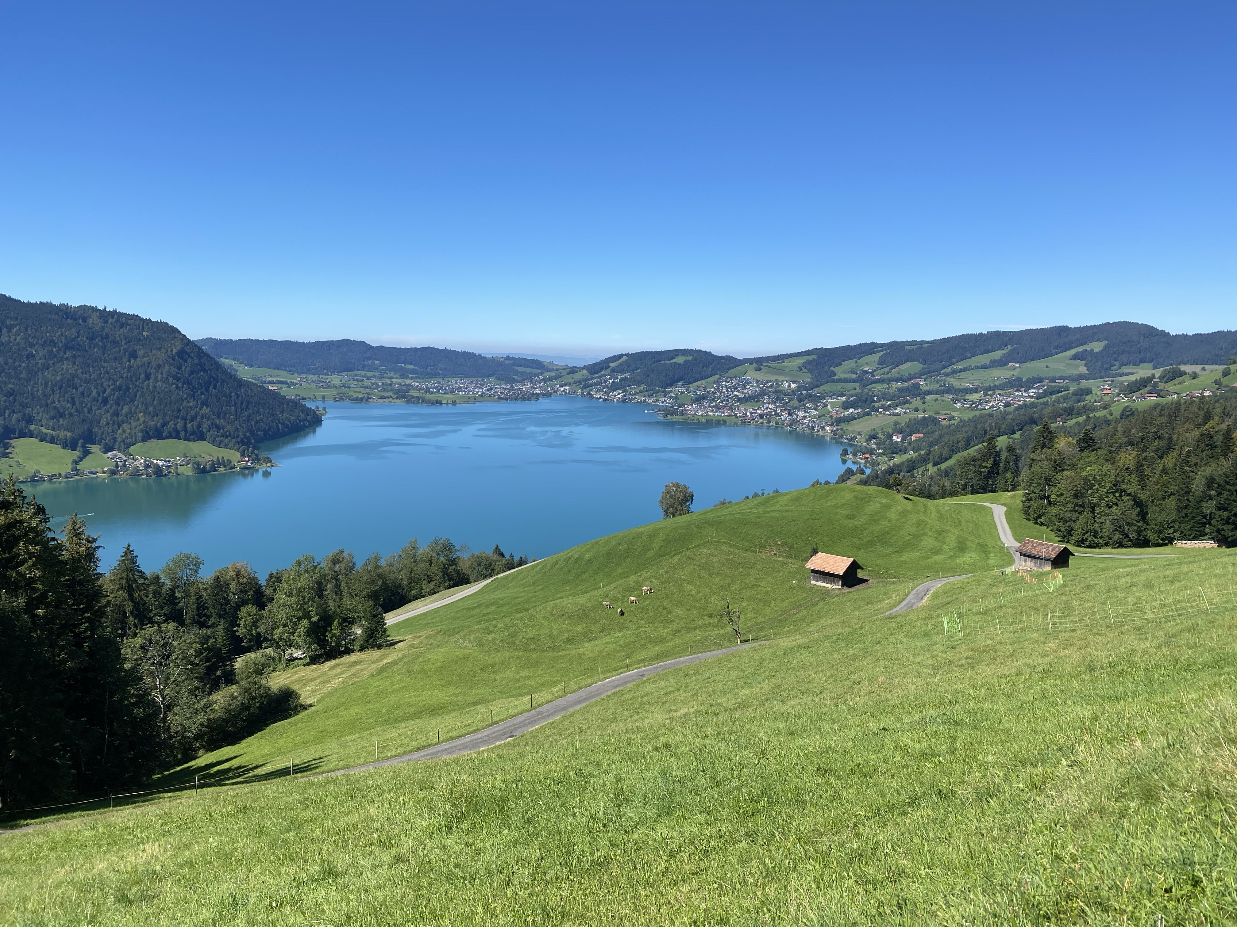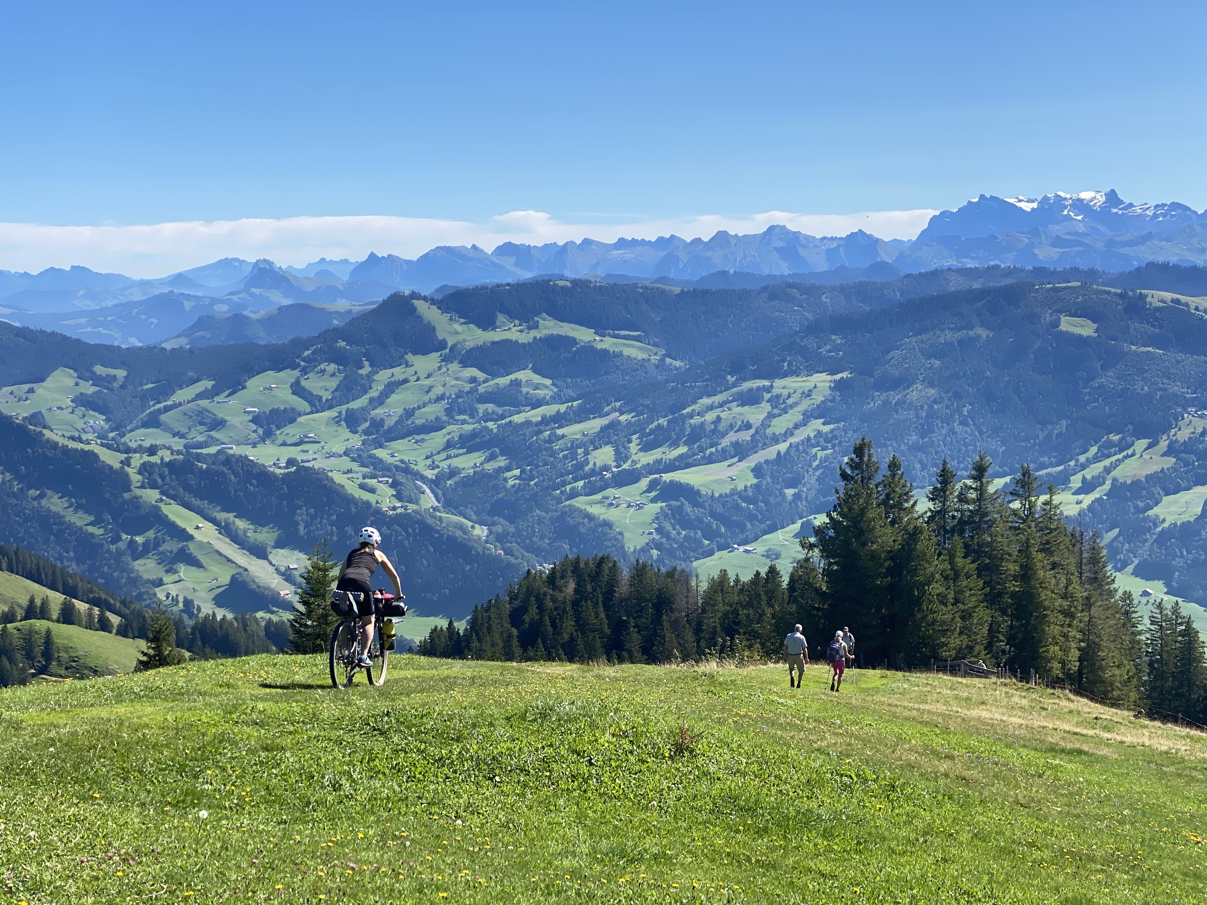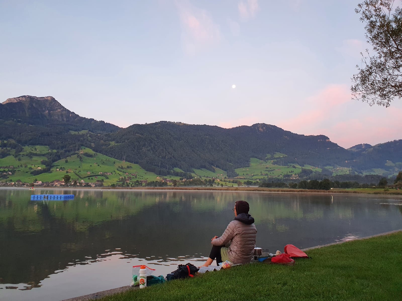 Am Gipfel angekommen ignorieren wir den Hinweis von netten schweizer Wanderern, dass man den Weg nicht radeln könne und fahren den ruppigen Trail Richtung Ägerisee ab. Auf einem Höhenweg geht es weiter zum Zugersee, wo wir wahnsinnig viele Raubvögel über uns kreisen sehen. Die Bauern haben ihre Wiesen gemäht und es duftet überall nach Heu. Wir beschließen noch eine „Flachland-Etappe“ dranzuhängen, die uns dann doch noch weitere 700 Höhenmeter einbringt. Wirklich flach ist hier eben nichts. Müde und zufrieden erreichen wir unser Ziel, den Campingplatz am Sempachersee. Heute schmeckt die Pasta auf jeden Fall besonders gut.