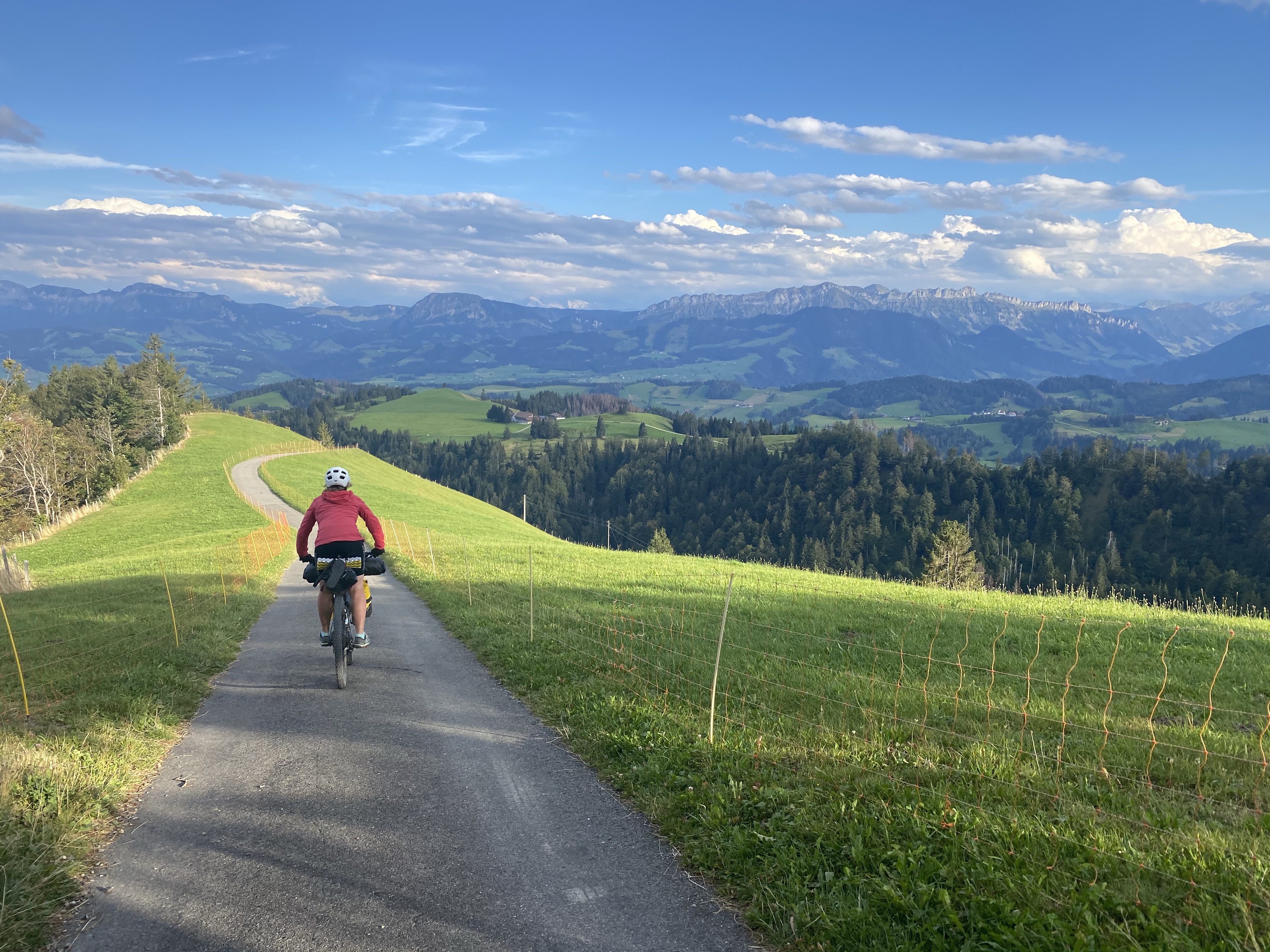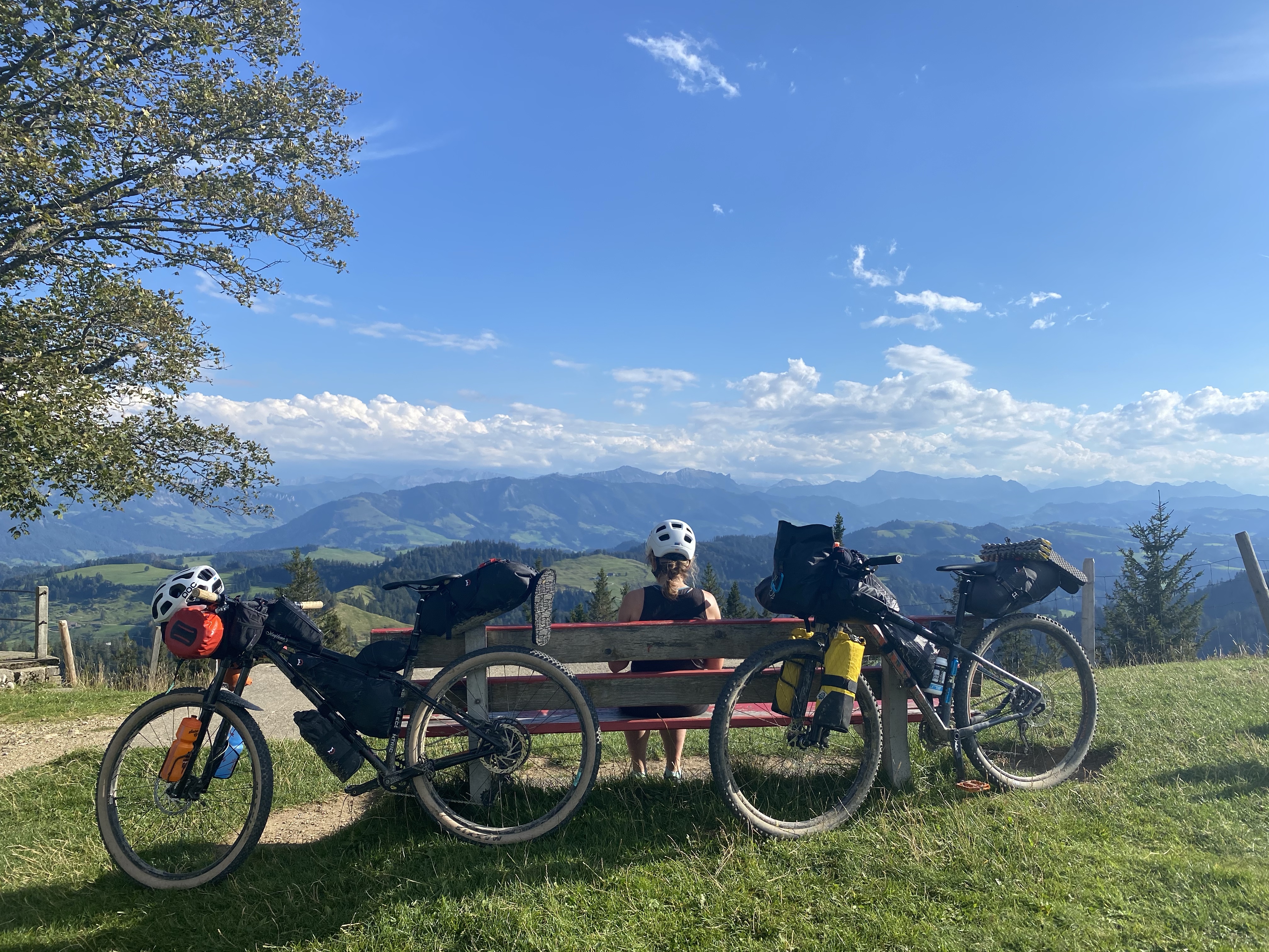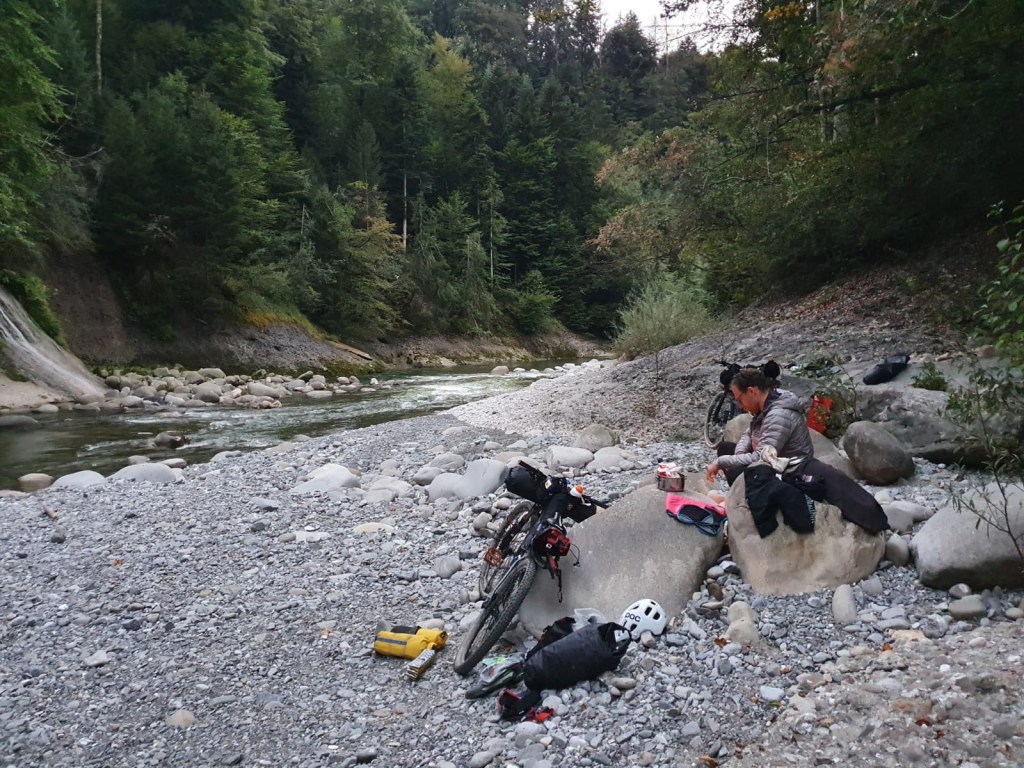 Wir kommen gut los und fahren noch eine Weile am Sempachersee entlang durch Apfelplantagen und vorbei an Bauernhöfen. Es geht noch einige Kilometer in der Ebene dahin bevor es dann sehr abrupt wieder steiler wird und wir schnell wieder jenseits der 1000 Meter Grenze sind. Wir befinden uns im UNESCO Naturschutzgebiet Entlebuch. Auf kleinen Wanderpfaden geht es immer weiter aufwärts. Zum Ende hin müssen wir die Räder nicht nur schieben sondern auch tragen. Ein echter Kraftakt nach dem anstrengenden Vortrag! Oben beim Berghotel Napf werden wir mal wieder mit einem tollen Ausblick auf die Berge und das hügelige Tal unter uns belohnt. Ein Mountainbiker gibt uns noch den Tip im Tal an der kleinen Emme einen Schlafplatz zu suchen mit dem Hinweis, dass es dort aussehen würde wie in Klein Kanada. Genauso ist es und nachdem wir noch in der Kleinen Emme gebadet haben kochen wir uns was und kriechen müde in unser Zelt.