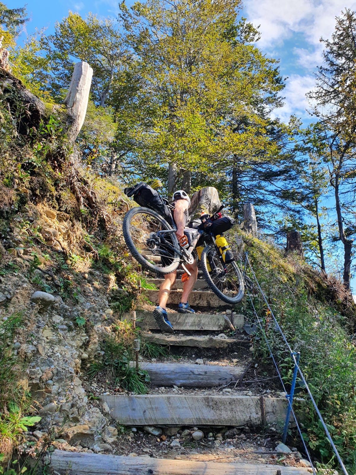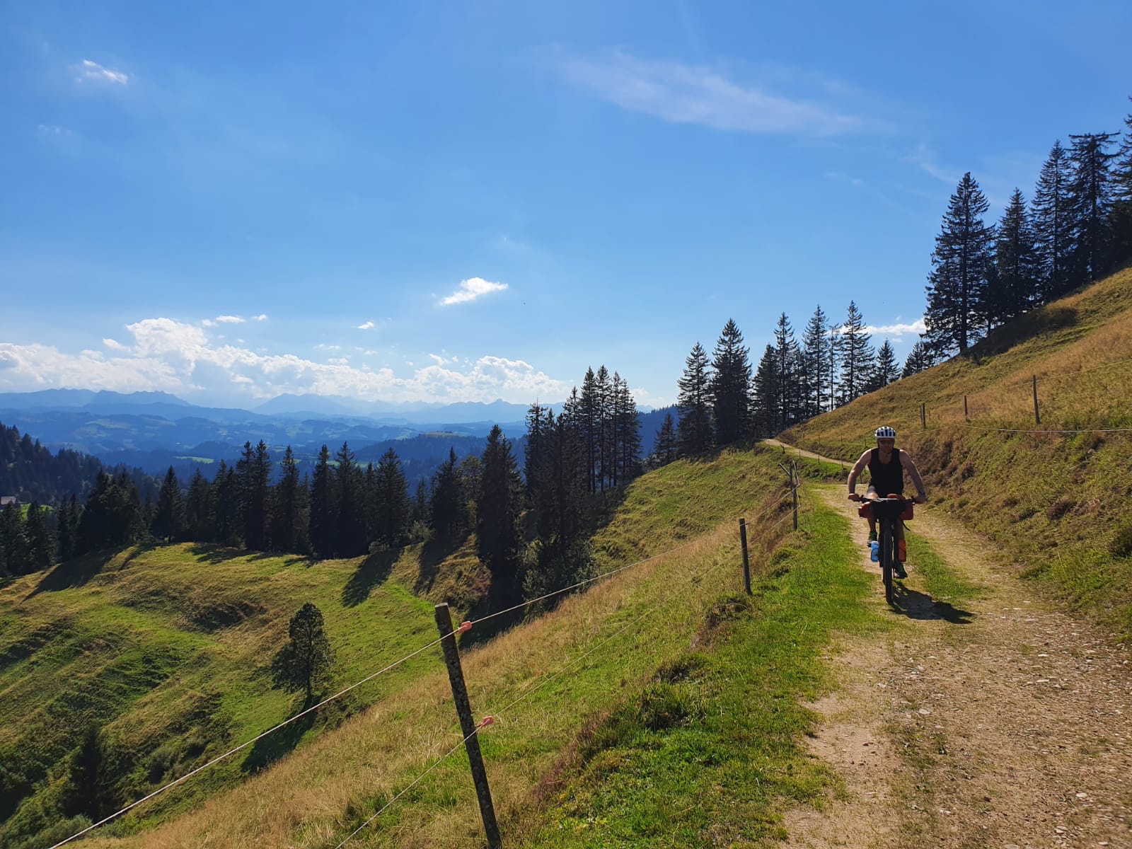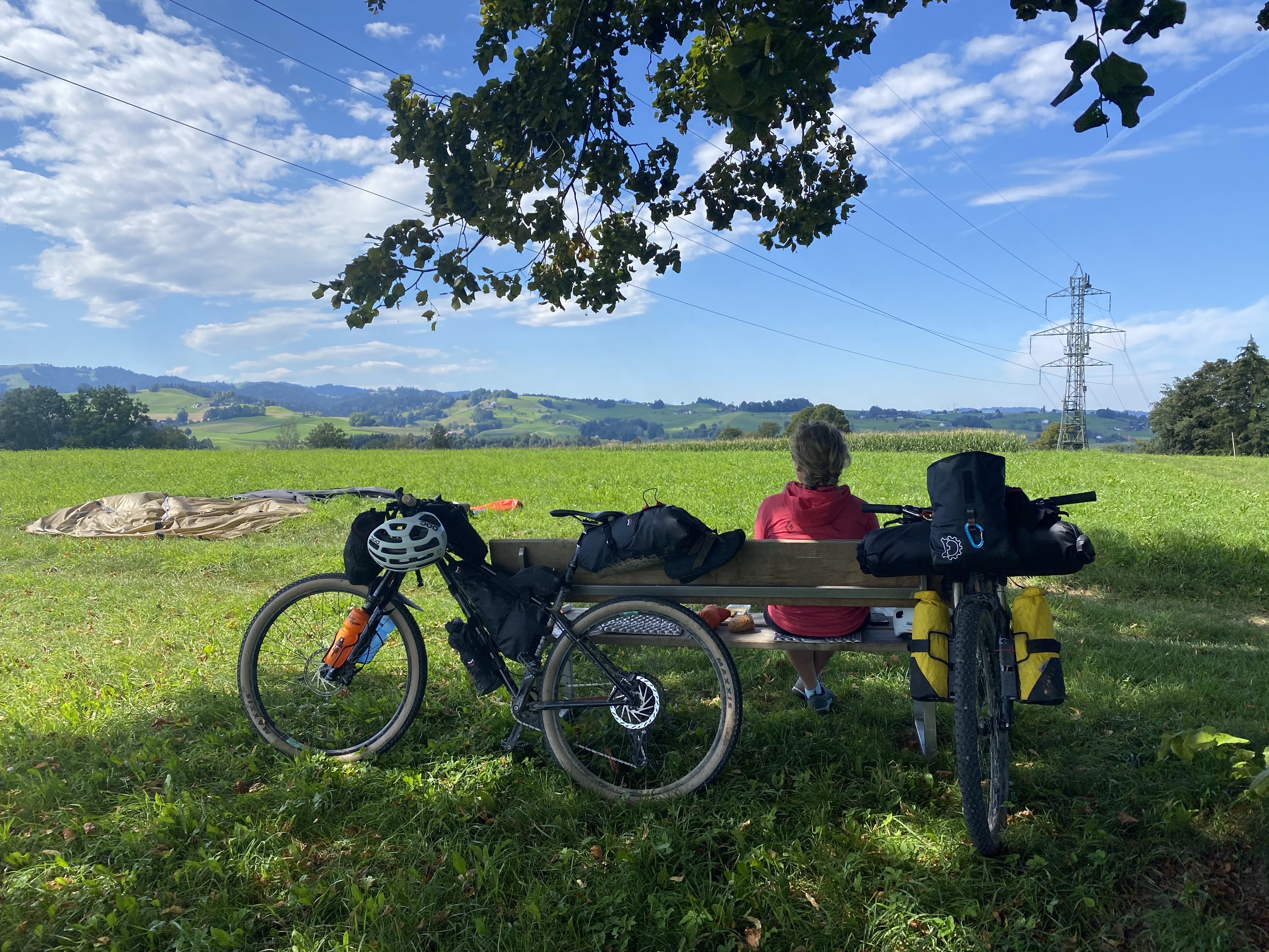Wir kommen gut los und fahren noch eine Weile am Sempachersee entlang durch Apfelplantagen und vorbei an Bauernhöfen. Es geht noch einige Kilometer in der Ebene dahin bevor es dann sehr abrupt wieder steiler wird und wir schnell wieder jenseits der 1000 Meter Grenze sind. Wir befinden uns im UNESCO Naturschutzgebiet Entlebuch. Auf kleinen Wanderpfaden geht es immer weiter aufwärts. Zum Ende hin müssen wir die Räder nicht nur schieben sondern auch tragen. Ein echter Kraftakt nach dem anstrengenden Vortrag! Oben beim Berghotel Napf werden wir mal wieder mit einem tollen Ausblick auf die Berge und das hügelige Tal unter uns belohnt. Ein Mountainbiker gibt uns noch den Tip im Tal an der kleinen Emme einen Schlafplatz zu suchen mit dem Hinweis, dass es dort aussehen würde wie in Klein Kanada. Genauso ist es und nachdem wir noch in der Kleinen Emme gebadet haben kochen wir uns was und kriechen müde in unser Zelt.