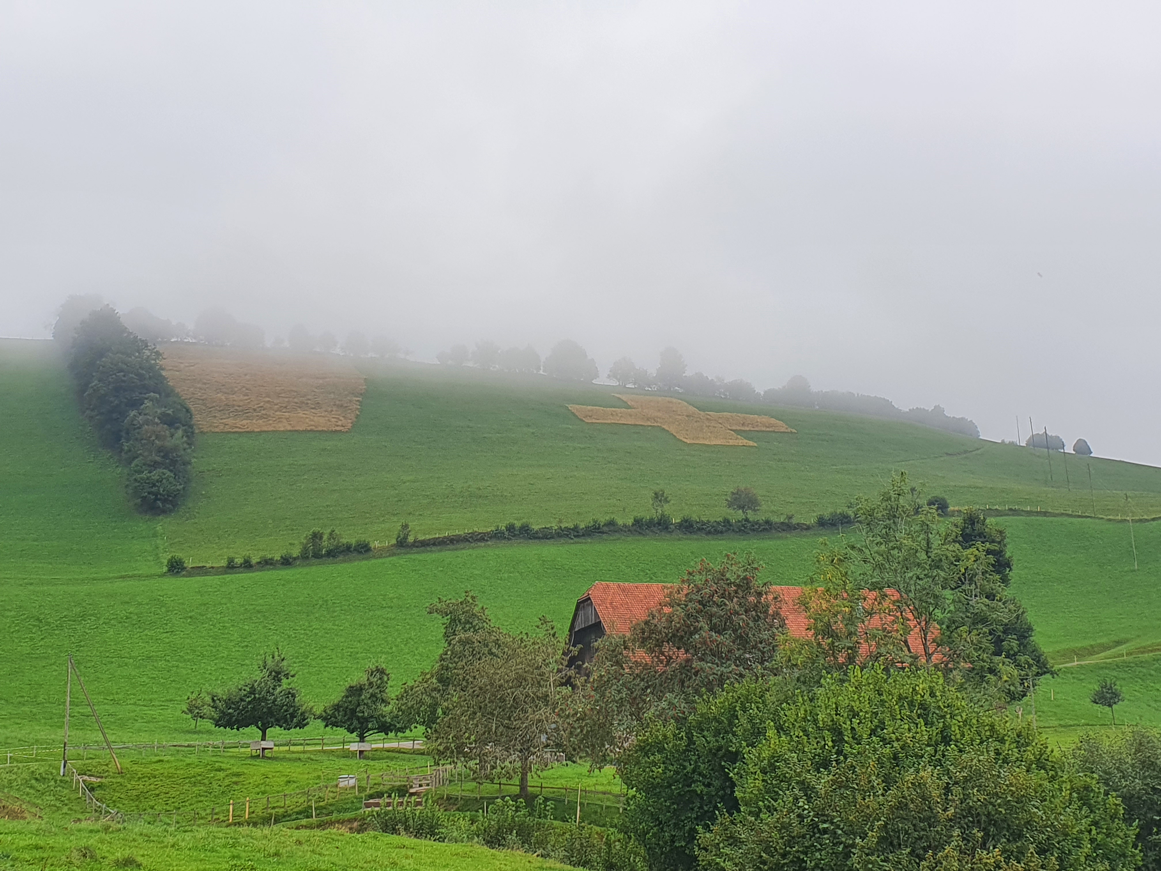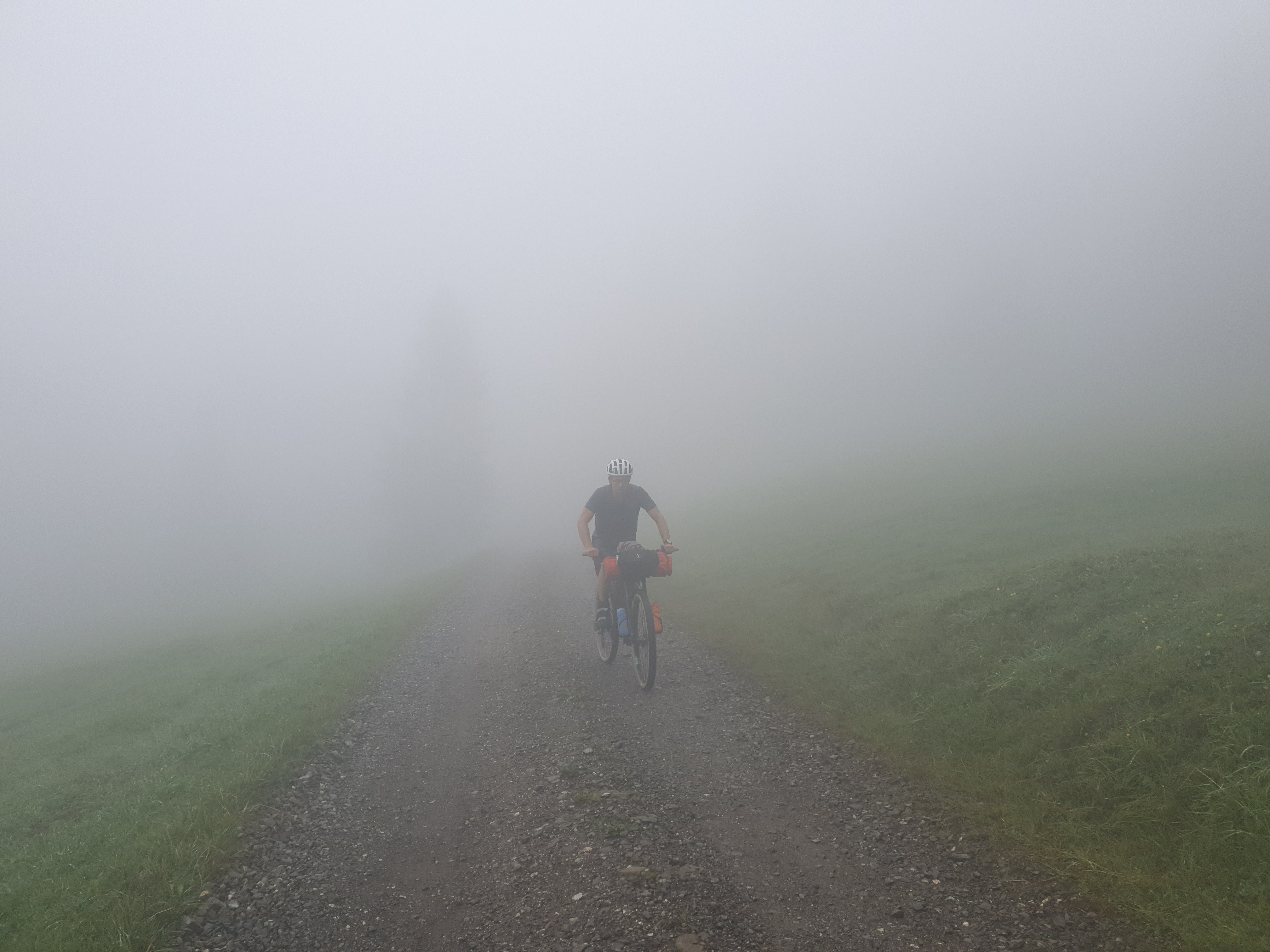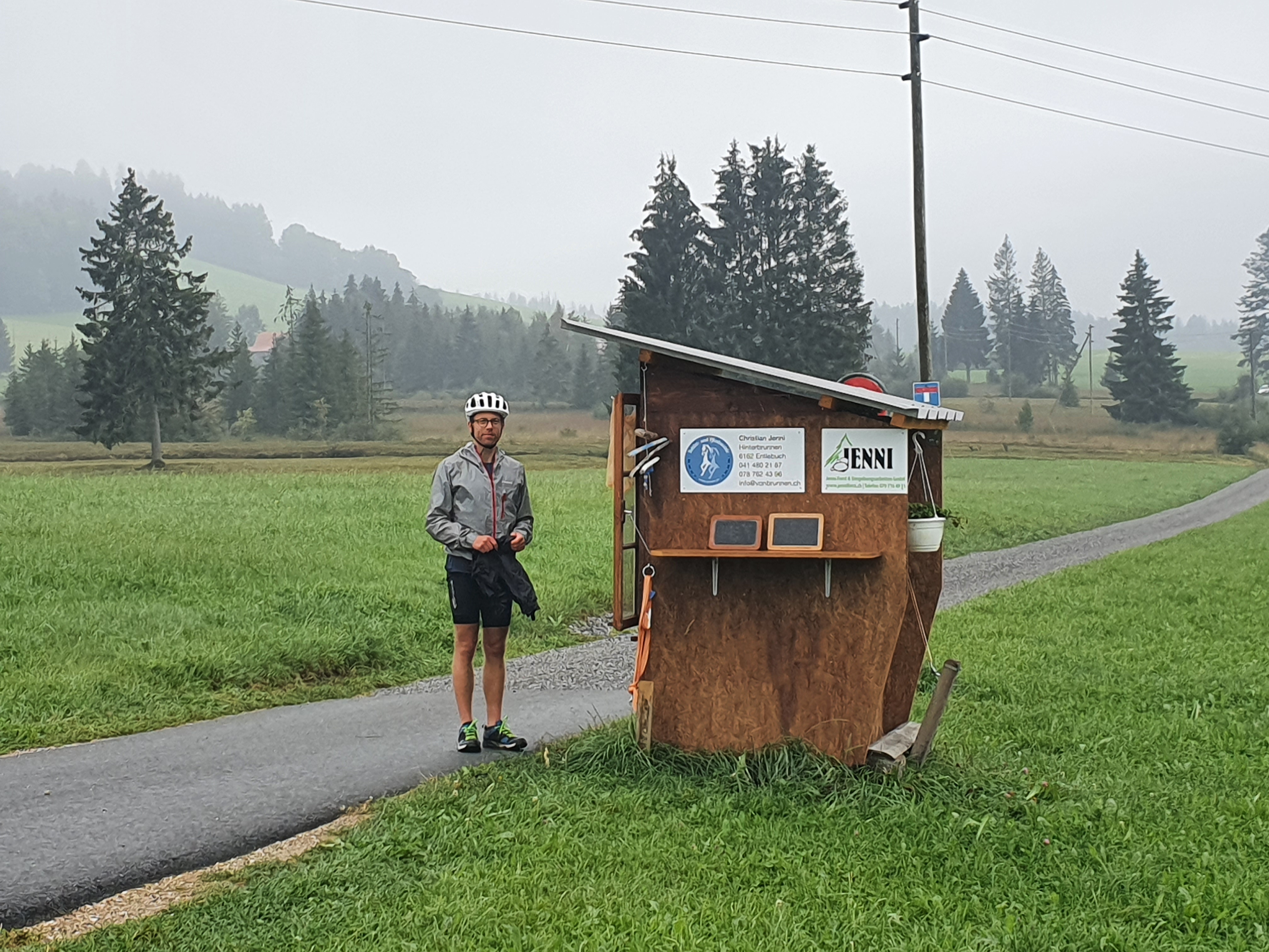 Zum ersten Mal ist sind das Zelt und der Boden nicht klatschnass, weil es aufgrund des steinigen Untergrunds am Flussufer keinen Tau gibt. Die Freude war zwar groß aber leider nur kurz. Noch bevor das Kaffeewasser kocht fängt es plötzlich an stark zu regnen. Hastig packen wir unsere Sachen zusammen und suchen unter den Bäumen Schutz. Wir beschließen spontan nach Entlebuch zu radeln und hoffen dort einen Bäcker zu finden wo wir frühstücken und wieder trocknen können. Wir haben Glück und bekommen ein lecker Frühstück. Der Regen lässt nach und es geht wieder in die Berge, die wegen des Nebels einen ganz verwunschenen Eindruck machen. Teilweise können wir nur zwei Radlängen weit gucken und bald wird der Regen auch wieder stärker. So sind wir froh in Flühli einen Campingplatz mit warmen Foyer zu finden. Hier können wir uns ausbreiten, da außer uns ausschließlich Dauercamper in ihren Mobile Homes hier residieren.