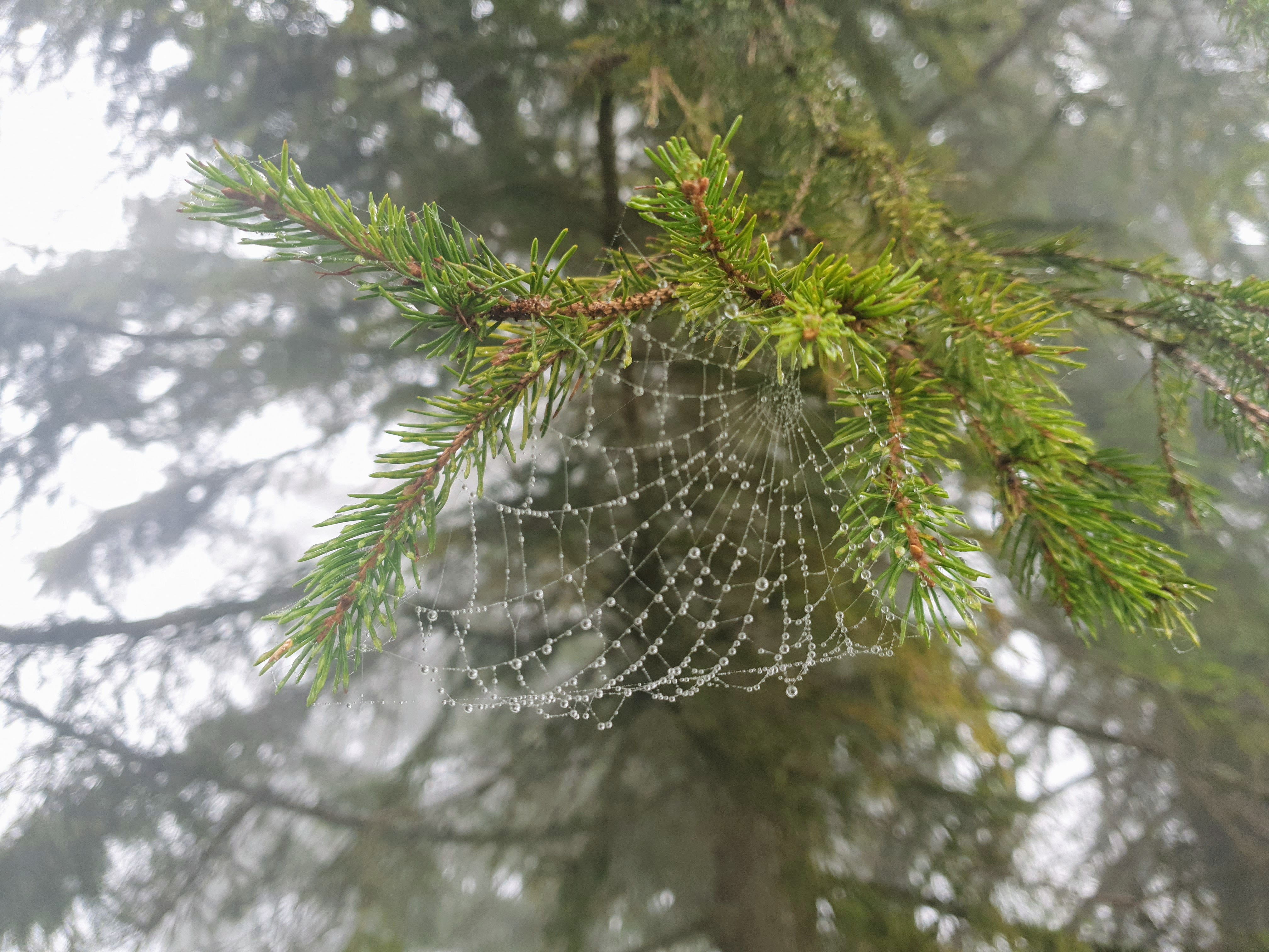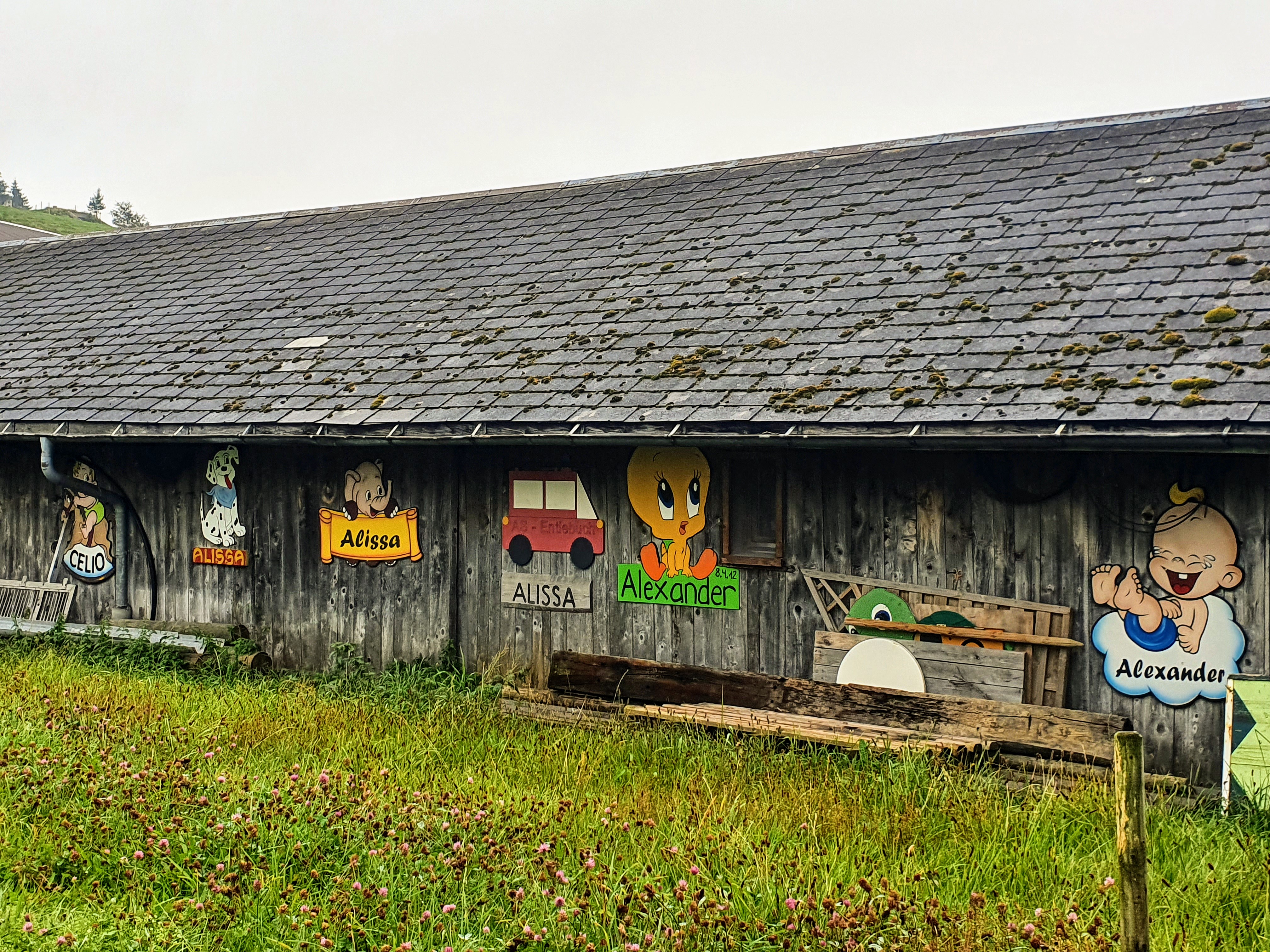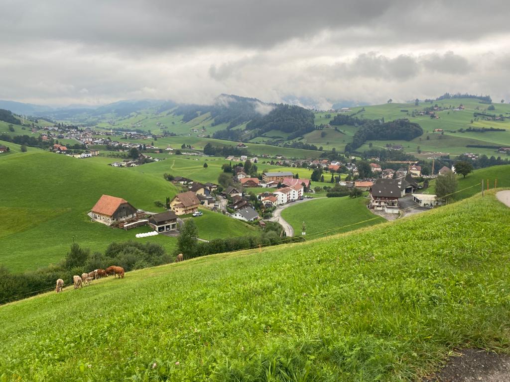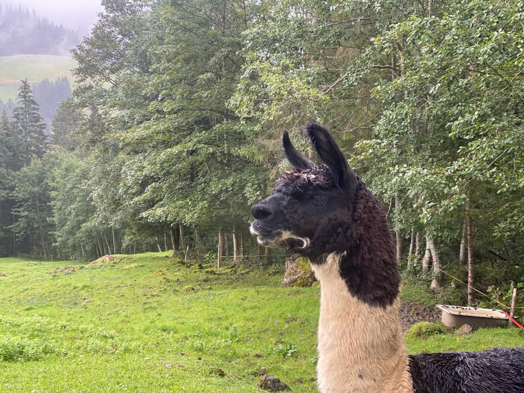 Zum ersten Mal ist sind das Zelt und der Boden nicht klatschnass, weil es aufgrund des steinigen Untergrunds am Flussufer keinen Tau gibt. Die Freude war zwar groß aber leider nur kurz. Noch bevor das Kaffeewasser kocht fängt es plötzlich an stark zu regnen. Hastig packen wir unsere Sachen zusammen und suchen unter den Bäumen Schutz. Wir beschließen spontan nach Entlebuch zu radeln und hoffen dort einen Bäcker zu finden wo wir frühstücken und wieder trocknen können. Wir haben Glück und bekommen ein lecker Frühstück. Der Regen lässt nach und es geht wieder in die Berge, die wegen des Nebels einen ganz verwunschenen Eindruck machen. Teilweise können wir nur zwei Radlängen weit gucken und bald wird der Regen auch wieder stärker. So sind wir froh in Flühli einen Campingplatz mit warmen Foyer zu finden. Hier können wir uns ausbreiten, da außer uns ausschließlich Dauercamper in ihren Mobile Homes hier residieren.