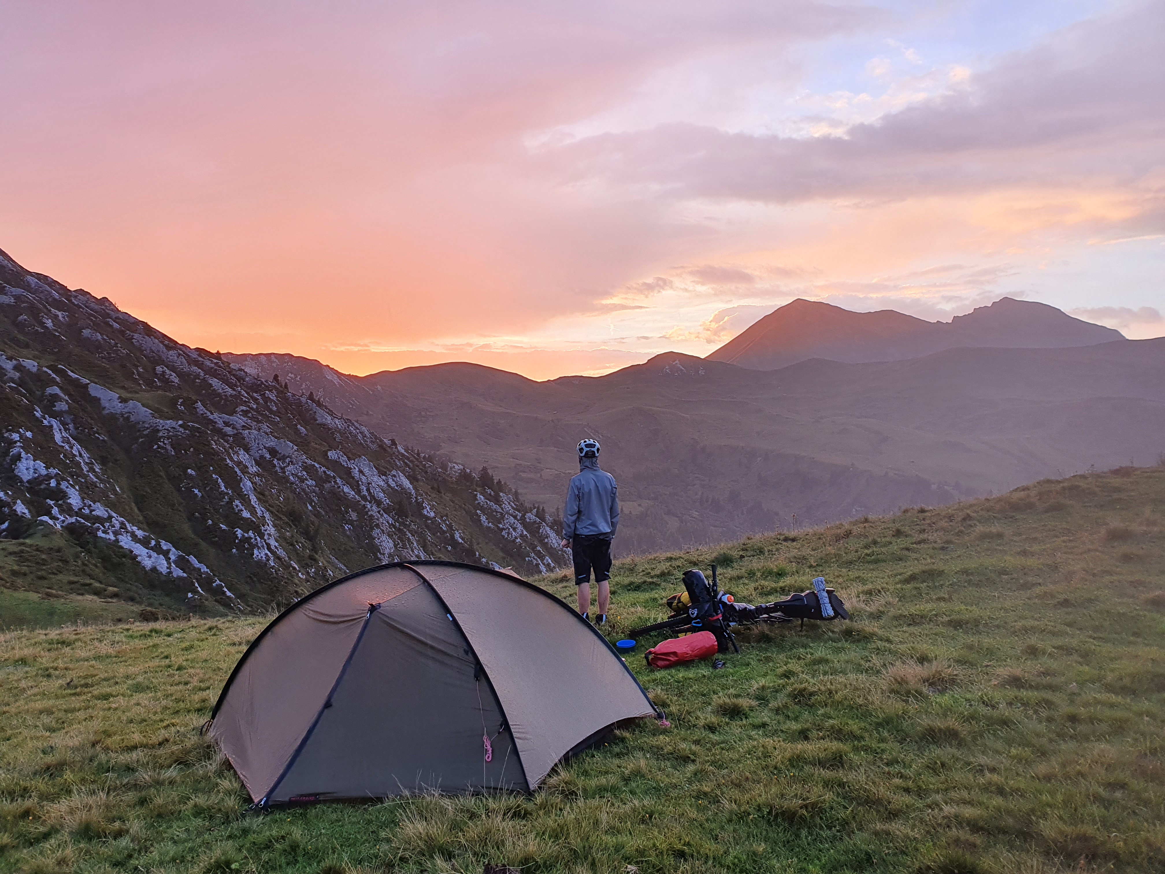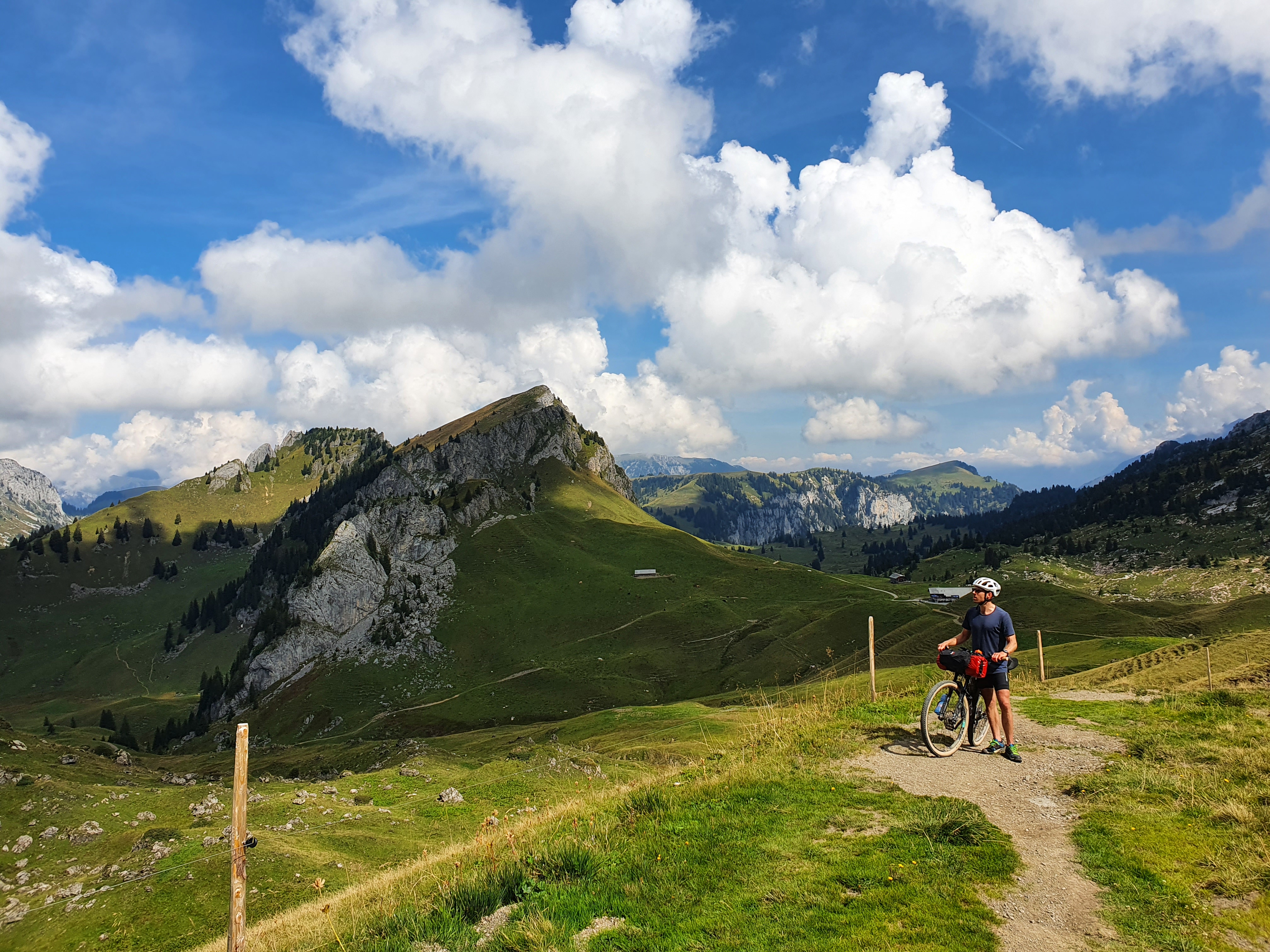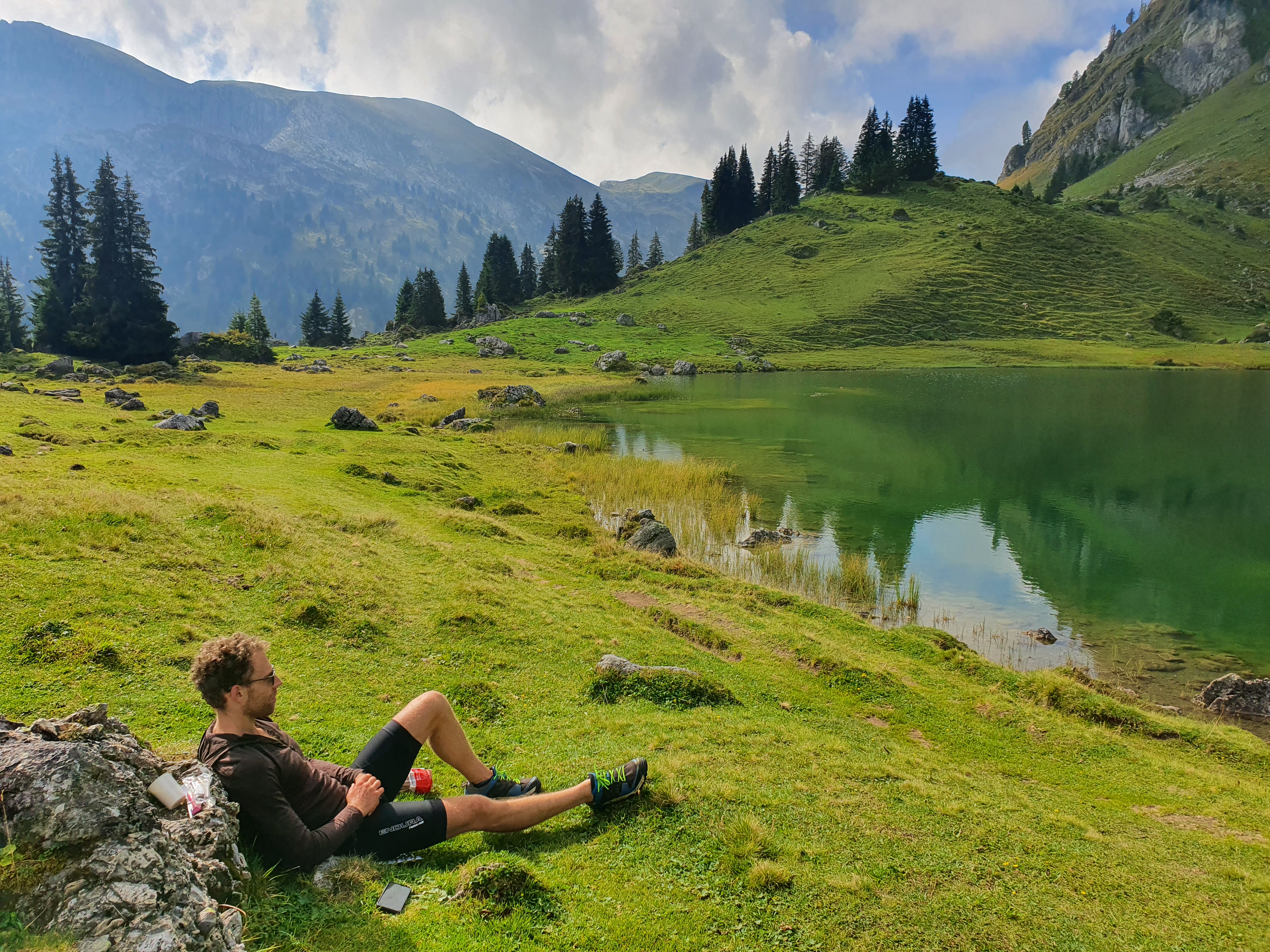 Der Tag beginnt mit einigen Kilometern auf einer Straße im Tal. Obwohl sie nicht sehr stark befahren ist fällt uns mal wieder auf wie viel entspannter es ist auf den sonst üblichen Forstwegen, Bergstrassen und Pfaden unterwegs zu sein. Dann geht’s aber nach dem obligatorischen Stop an einem Käsekühlschrank gleich wieder bergauf. Auf einer gut radelbaren Forststrasse fahren wir hinauf zum Seebergsee und gönnen uns eine ausgiebige Pause in der Sonne. Danach erwarten uns (zumindest für einen von uns durchweg fahrbare;-) 900hm herrliche Trailabfahrt. Jippieh! Nach einem Versorgungsstop in Lenk wollen wir gerade weiter zum nächsten Pass als es leicht anfängt zu regnen. Davon lassen wir uns ganz optimistisch natürlich nicht abschrecken und werden nochmal so richtig nass. Als sich der Weg dann auch noch in einen Bach verwandelt wird es heute fast noch etwas abenteuerlich. Oben angekommen hört es zum Glück etwas auf zu regnen und wir finden einen schönen Platz für unser Zelt. Zum Glück wurden wir heute Nacht nicht von neugierigen Kühen geweckt.