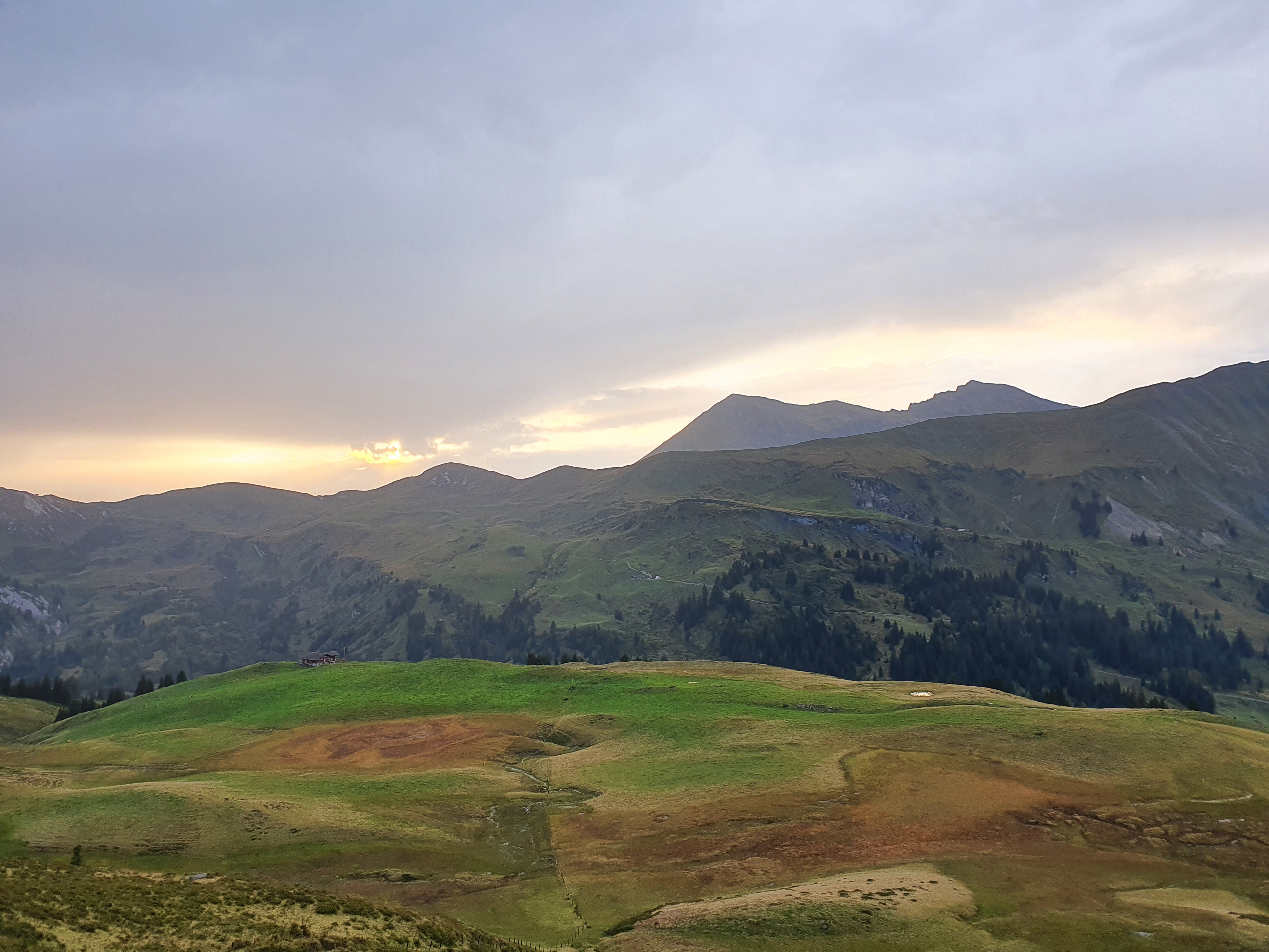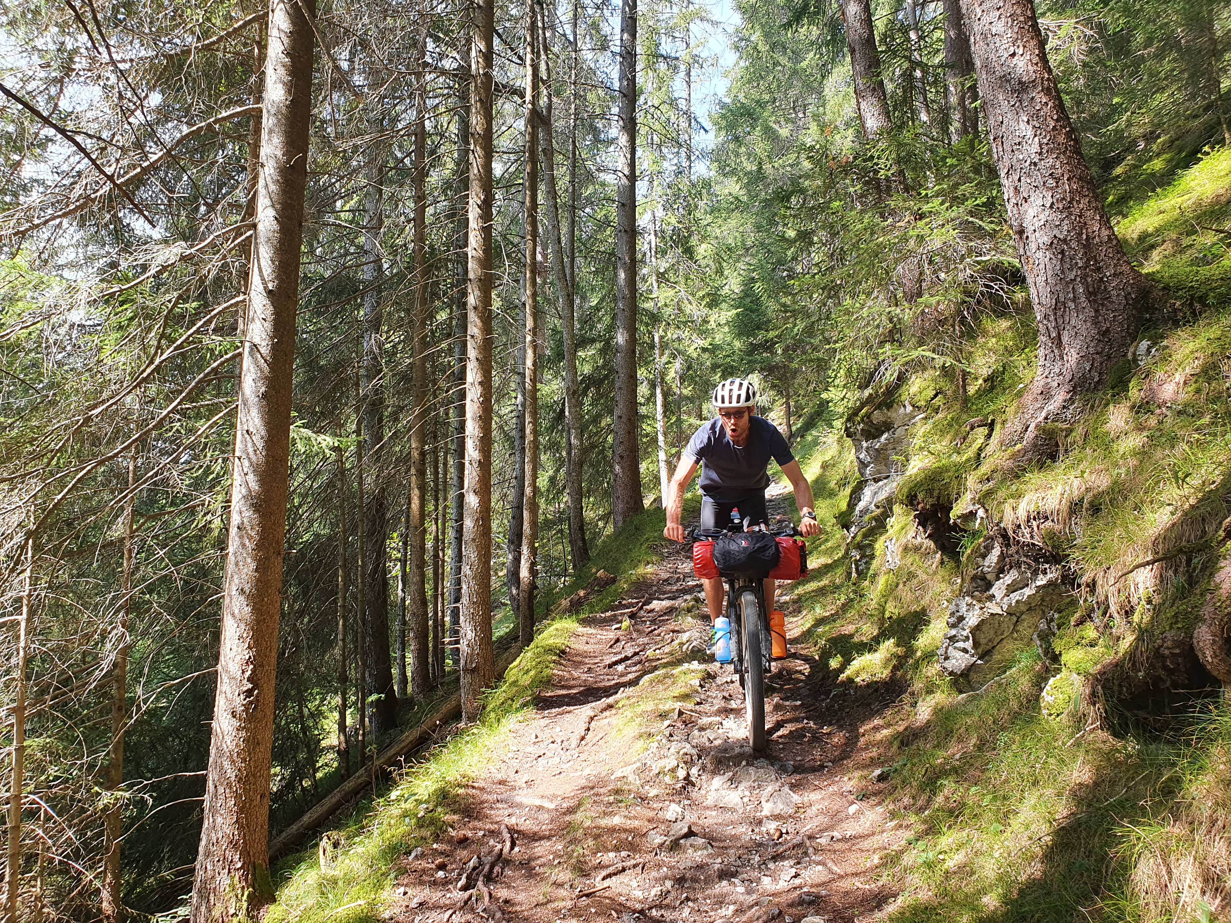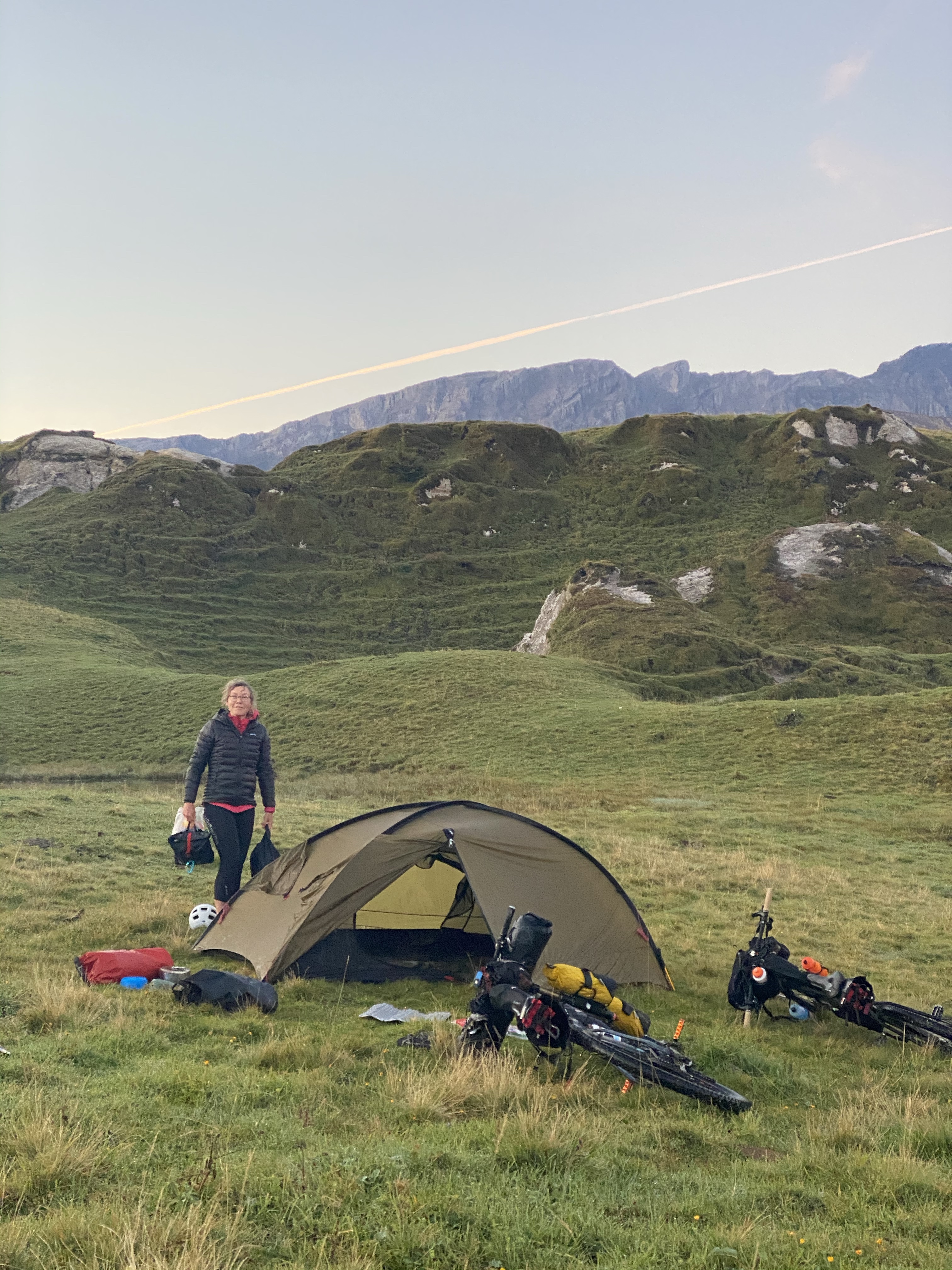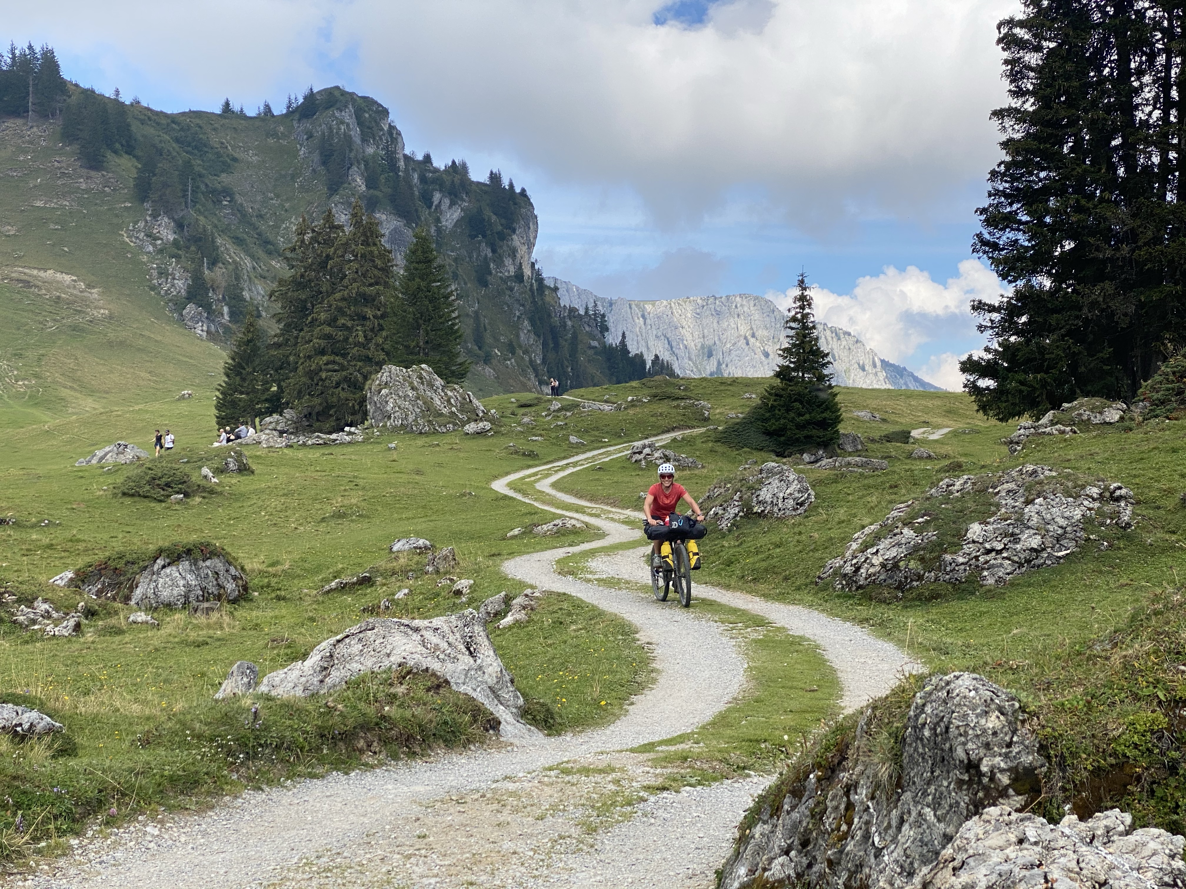 Der Tag beginnt mit einigen Kilometern auf einer Straße im Tal. Obwohl sie nicht sehr stark befahren ist fällt uns mal wieder auf wie viel entspannter es ist auf den sonst üblichen Forstwegen, Bergstrassen und Pfaden unterwegs zu sein. Dann geht’s aber nach dem obligatorischen Stop an einem Käsekühlschrank gleich wieder bergauf. Auf einer gut radelbaren Forststrasse fahren wir hinauf zum Seebergsee und gönnen uns eine ausgiebige Pause in der Sonne. Danach erwarten uns (zumindest für einen von uns durchweg fahrbare;-) 900hm herrliche Trailabfahrt. Jippieh! Nach einem Versorgungsstop in Lenk wollen wir gerade weiter zum nächsten Pass als es leicht anfängt zu regnen. Davon lassen wir uns ganz optimistisch natürlich nicht abschrecken und werden nochmal so richtig nass. Als sich der Weg dann auch noch in einen Bach verwandelt wird es heute fast noch etwas abenteuerlich. Oben angekommen hört es zum Glück etwas auf zu regnen und wir finden einen schönen Platz für unser Zelt. Zum Glück wurden wir heute Nacht nicht von neugierigen Kühen geweckt.