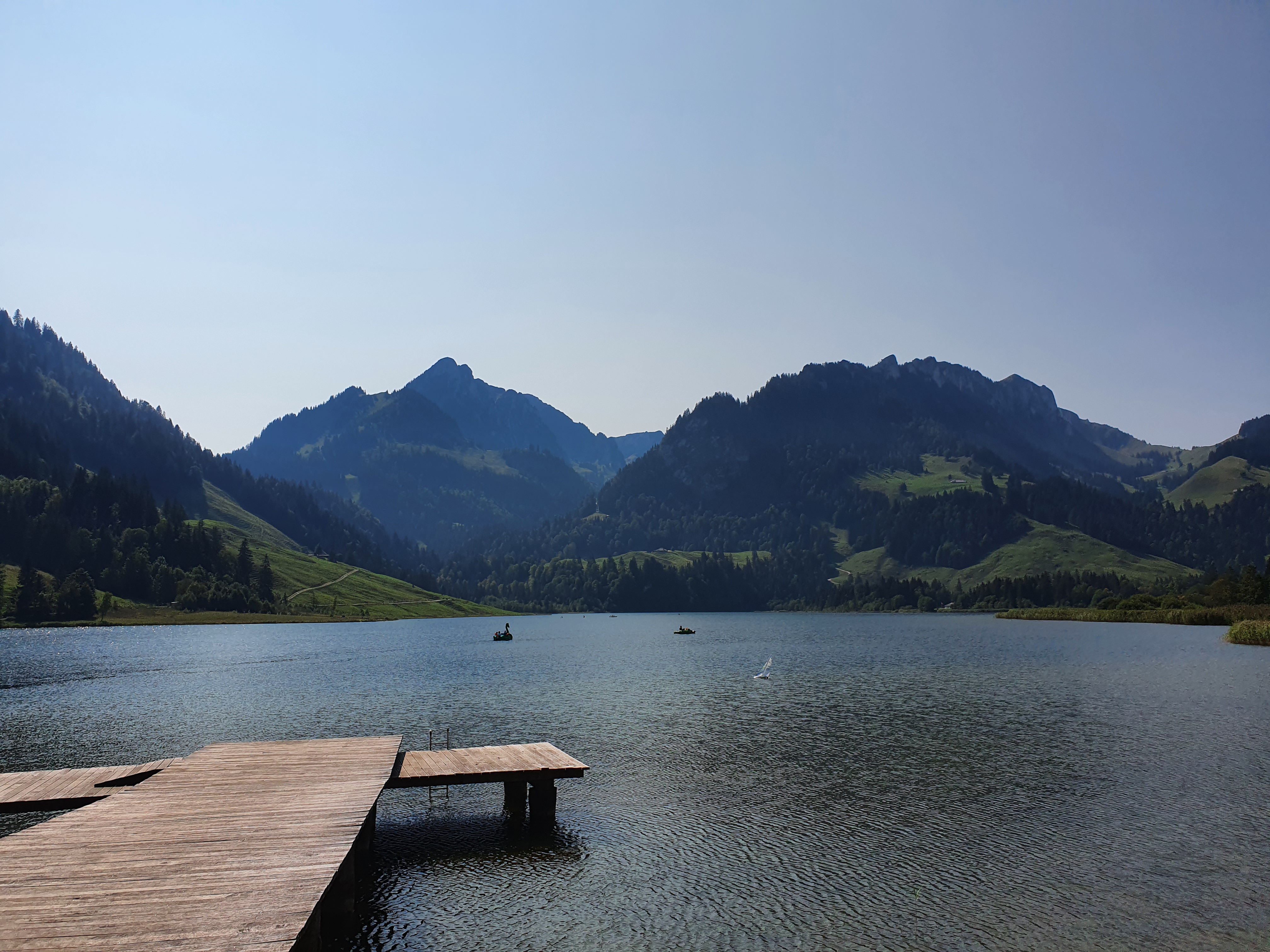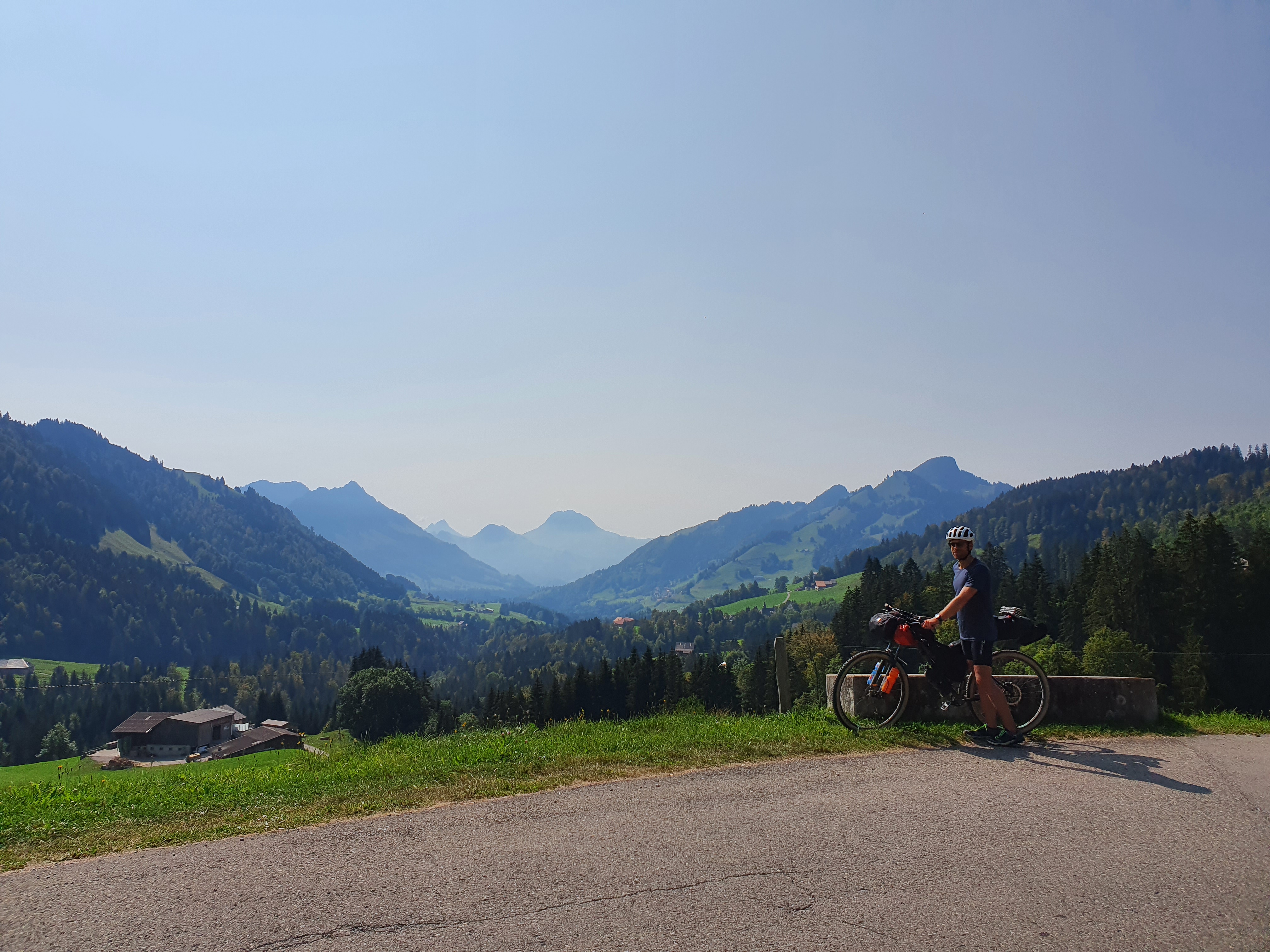 Heute stehen drei Pässe auf dem Programm, weil wir es unbedingt bis zum Lac de la Gruyère schaffen wollen. Während uns Morgens während der Abfahrt noch die Finger abfallen, weil es so kalt ist, trifft uns während des zweiten Aufstiegs am Schwarzsee der Hitzschlag. Alle Brunnen sind von Tageswanderern umzingelt, die in dem kühlen Nass die Erlösung suchen. Wir fahren an der deutsch-französischen Sprachgrenze entlang und rätseln beim Einkaufen und am Campingplatz jedesmal welche Sprache jetzt wohl gerade die richtige ist. Das Gebiet um den Lac de la Gruyère ist wunderschön, hügelig mit kleinen hübschen Örtchen. Irgendwie fühlt sich hier alles viel südlicher an obwohl wir ja gar nicht so weit von unserem Startpunkt entfernt sind. Mag aber auch am jetzt beständig sonnigen Wetter liegen. Wir finden hier einen kleinen Zeltplatz und können endlich mal wieder duschen.
