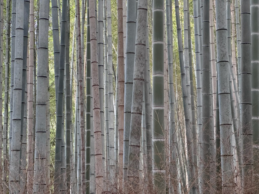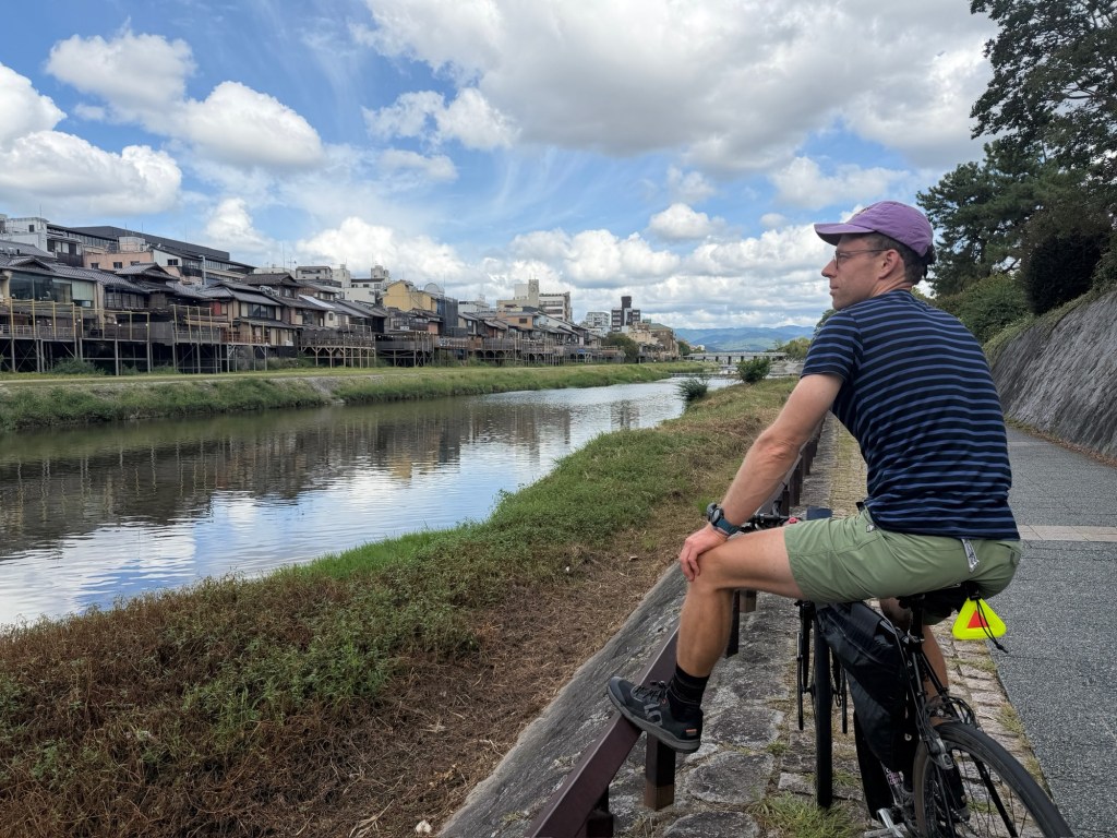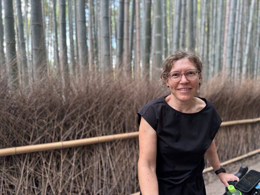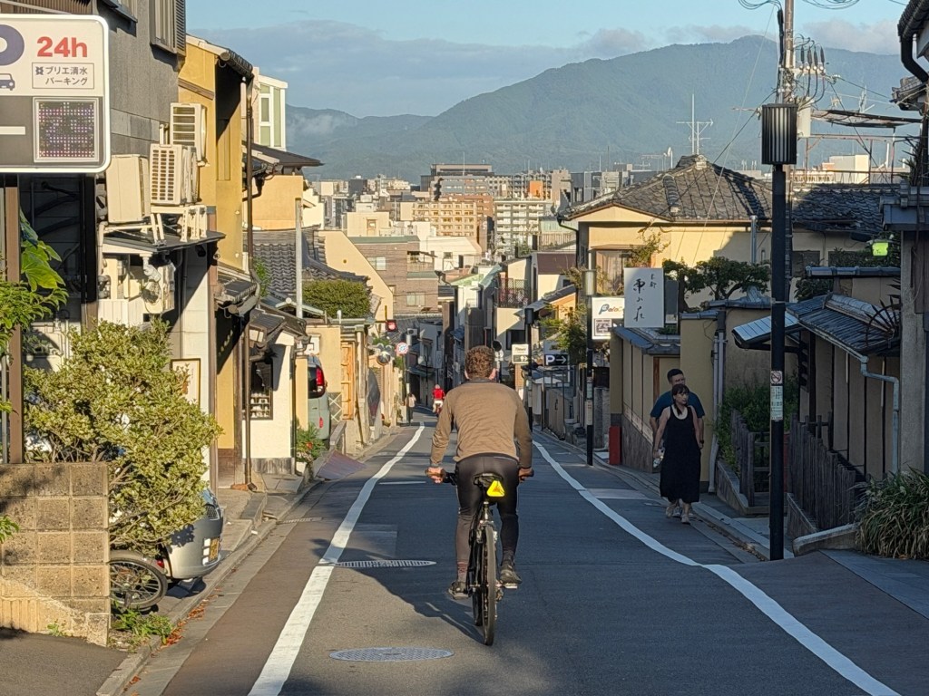 Nach einem kleinen Snack und einem Schläfchen im Kyoto Gyoen Nationalgarten brechen wir zu einer größeren Erkundungstour mit den Rädern auf. Diese führt uns auf meist kleinen Nebenstraßen durch Wohngebiete, vorbei an Schreinen, Tempeln und Macha Cafés hin zum bekannten Bambuswald. Letzterer ist aber sehr voll mit Touristen und wir sind froh als wir wieder auf den kleinen Nebenstraßen sind. Radlfahrer haben es sehr angenehm in Kyoto, es scheint fast so als hätten sie einen anerkannten Sonderstatus. Wir machen es den Einheimischen gleich und halten uns weder an Einbahnstraßen, Linksfahrgebot oder Ampeln. Wahlweise nutzen wir auch den Bürgersteig, wenn es auf der Straße nicht vorwärts geht.