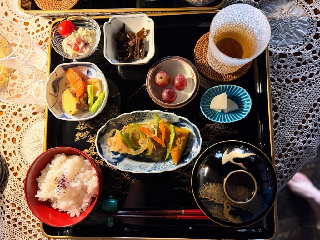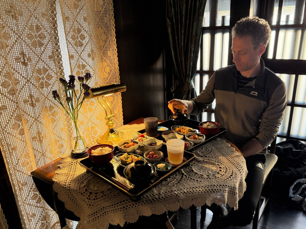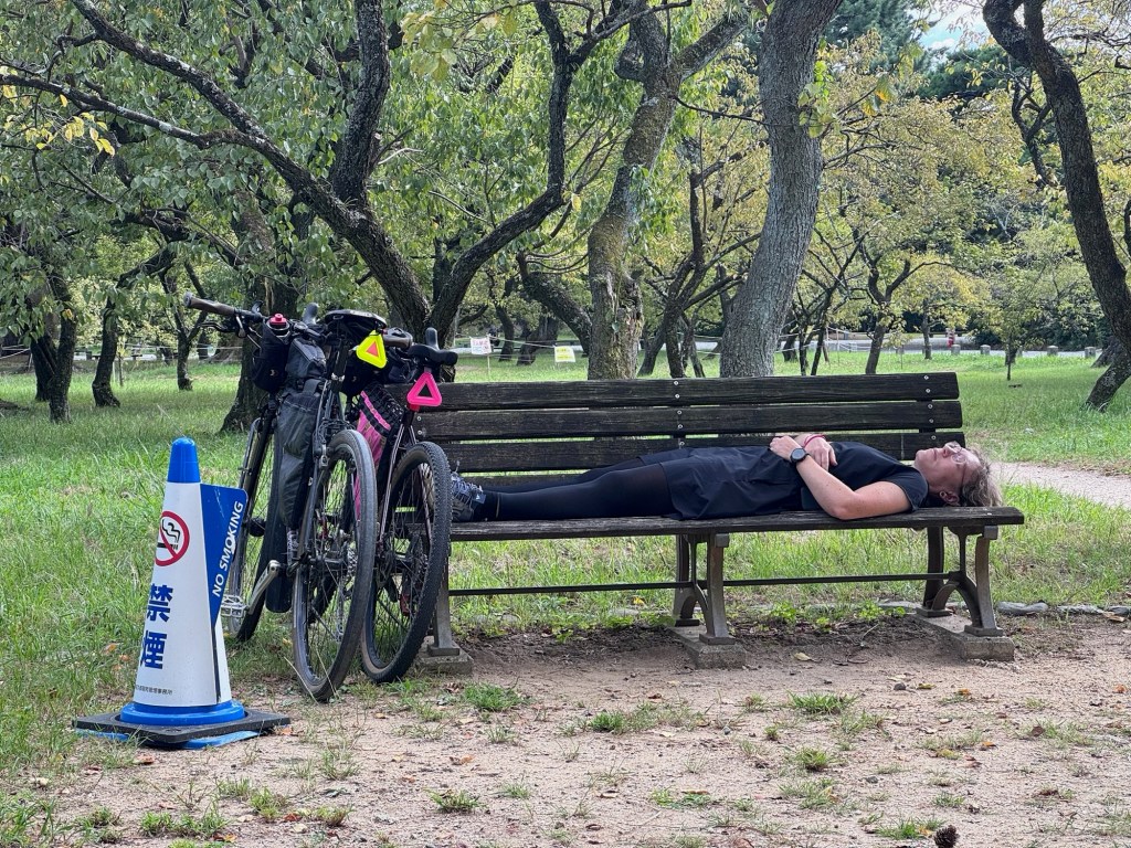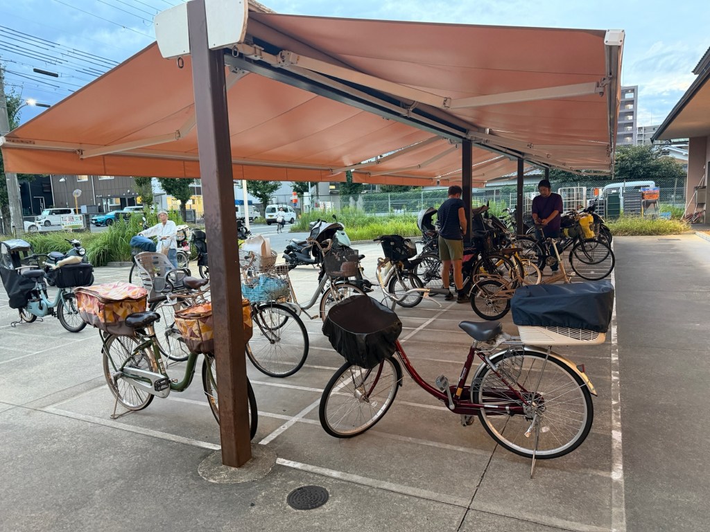 Nach einem kleinen Snack und einem Schläfchen im Kyoto Gyoen Nationalgarten brechen wir zu einer größeren Erkundungstour mit den Rädern auf. Diese führt uns auf meist kleinen Nebenstraßen durch Wohngebiete, vorbei an Schreinen, Tempeln und Macha Cafés hin zum bekannten Bambuswald. Letzterer ist aber sehr voll mit Touristen und wir sind froh als wir wieder auf den kleinen Nebenstraßen sind. Radlfahrer haben es sehr angenehm in Kyoto, es scheint fast so als hätten sie einen anerkannten Sonderstatus. Wir machen es den Einheimischen gleich und halten uns weder an Einbahnstraßen, Linksfahrgebot oder Ampeln. Wahlweise nutzen wir auch den Bürgersteig, wenn es auf der Straße nicht vorwärts geht.