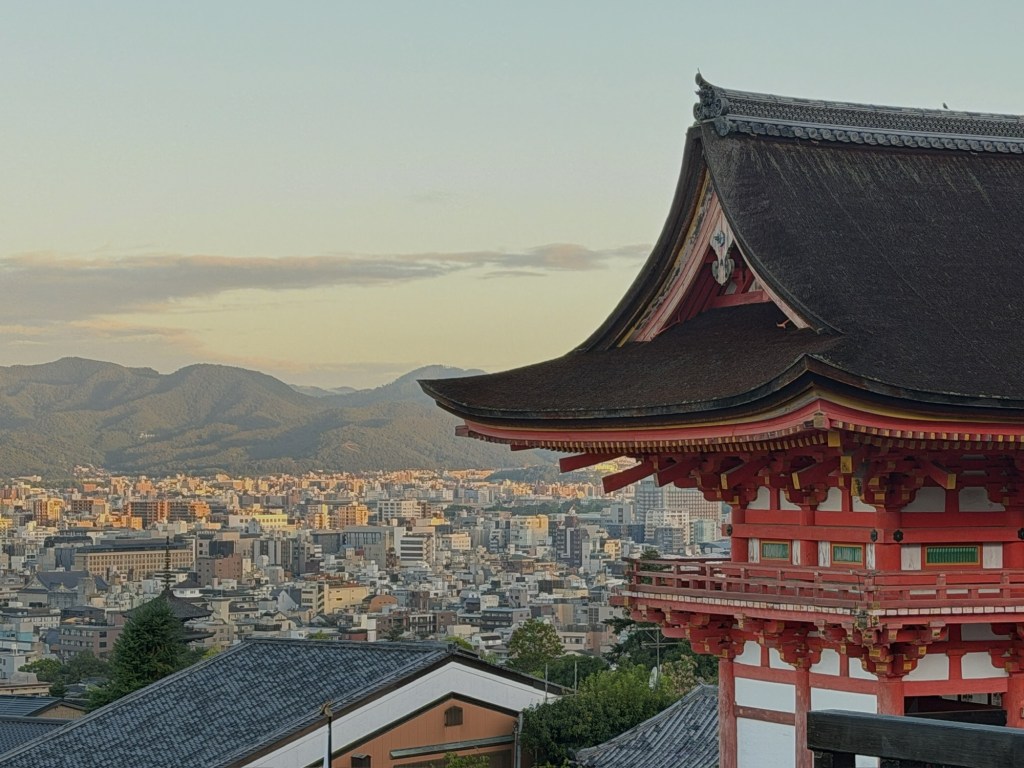 In Kyōto gibt es tausende buddhistischer Tempel und Shinto Schreine und einige von ihnen werden von Touristen völlig überrannt. Deswegen beginnen wir den Tag heute sehr früh. Wir radeln noch vor Sonnenaufgang zum buddhistischen Kiyomizu-Dera-Tempel. Von den Holzterrassen des Tempels hat man einen grandiosen Blick über die Stadt und morgens ist die Atmosphäre noch entspannt.