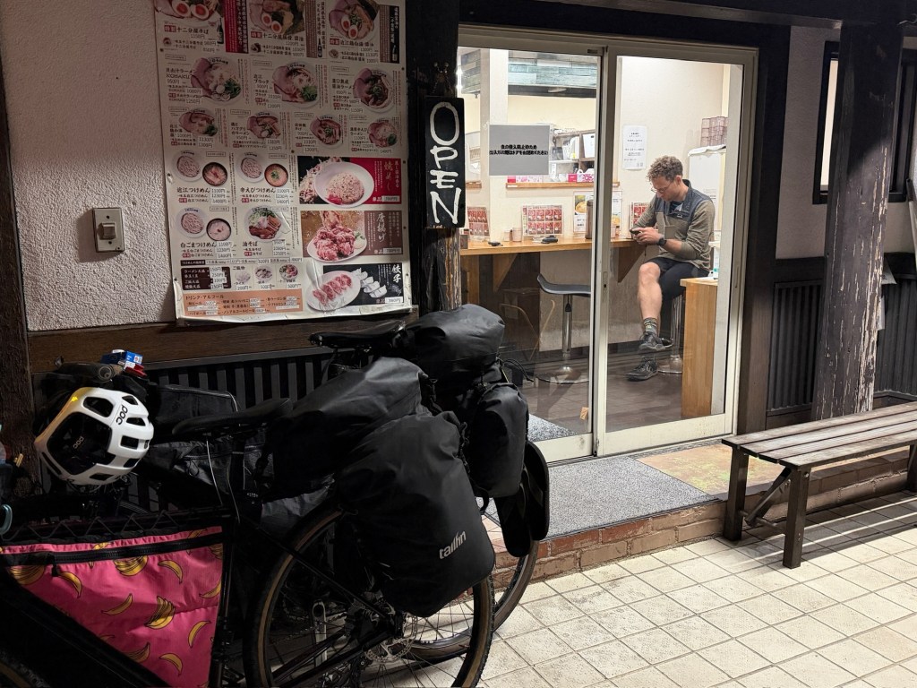 Als wir dann um 18 Uhr am Campingplatz ankommen ist es schon stockfinster. Das Problem: Es gibt dort gar keinen Campingplatz. Wir fahren erstmal in die nah gelegene Stadt und stärken uns mit einem Teller Ramen für das was jetzt noch kommen mag. Wir probieren dann unser Glück bei einem anderen auf unserer Karte eingezeichneten Platz am Waldrand. Der ist zwar verlassen aber offen. Wir schreiben die Zeilen vor dem Zelt sitzend und staunen über exotische Tierlaute, die aus dem Wald dringen und die wir noch nie gehört haben.