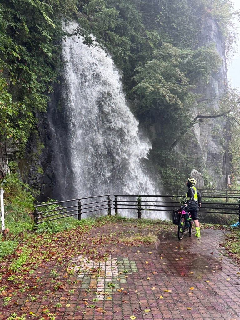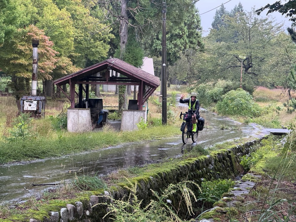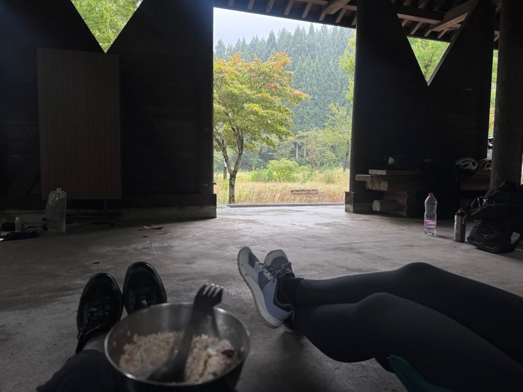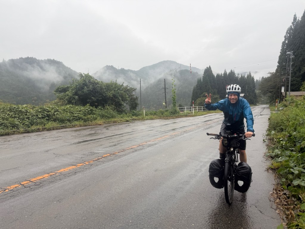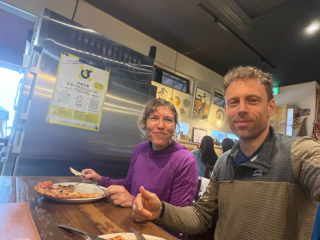 Also frühstücken, rein in die volle Regenmontur und los geht’s. Es tropft satt und beständig vor sich hin aber ist immerhin noch warm. Unser Weg führt ein grünes Flusstal entlang, wieder gibt es wenig Autos und Affen sitzen am Wegrand. Auf einer schnellen Abfahrt kreuzt plötzlich ein kleiner Bär vor uns die Straße, wir schalten die Kette nach rechts und geben Stoff. Dann fahren wir zum ersten Mal auf einer etwas stärker befahrenen Straße und sind wieder mal beeindruckt von der gigantischen Infrastruktur. Brücken, Galerien, breite Straßen, Staudämme und überall wird gebaut. Wir machen Rast in einer Kleinstadt wo wir Camping Gas nachkaufen und die vielleicht beste Pizza Japans essen. Wir scheinen einen sehr bedürftigen Eindruck zu machen, denn in beiden Fällen bekommen wir Wegzehrung geschenkt, nachdem wir sagen, dass wir nach Tokio radeln. Die letzten Kilometer geht es dann nochmal bergauf zum Skiresort Hirugano, womit wir auch wieder auf unserer ursprünglich geplanten Route sind. Die Gegend ist hier deutlich belebter. Wir hoffen also wieder auf einen geöffneten Campingplatz und diesmal, in der dritten Nacht, haben wir Glück! Nach dem wir vom beständigen Regen komplett durchnässt sind und es hier oben auf 870m deutlich kühler ist, mieten wir uns sogar in eine kleine Hütte auf dem Platz ein.