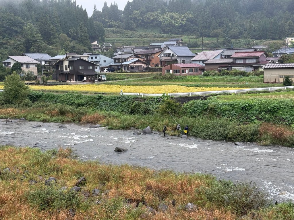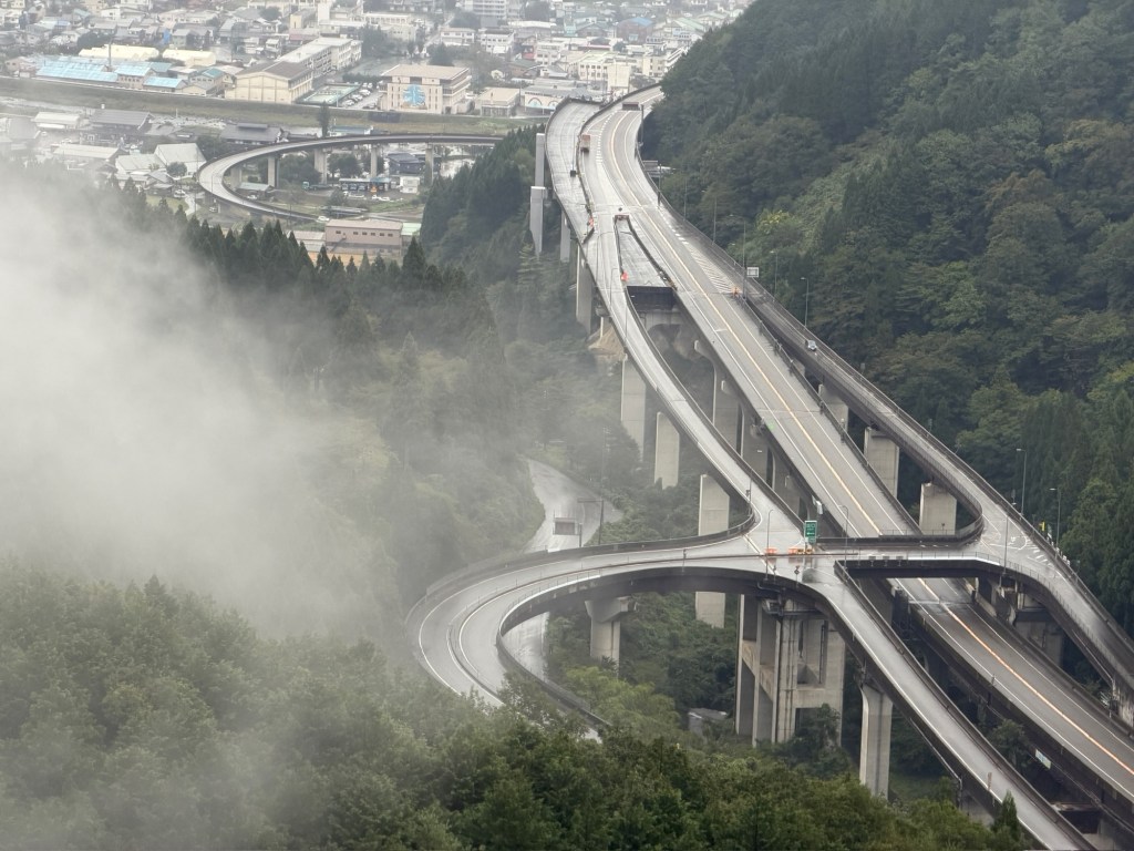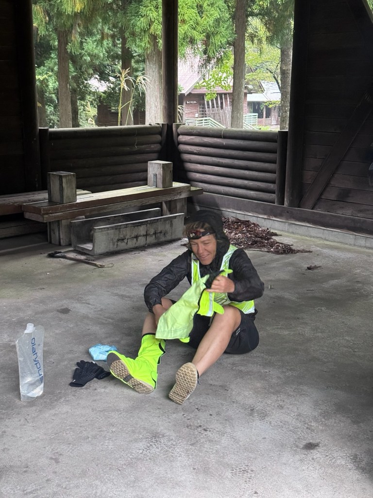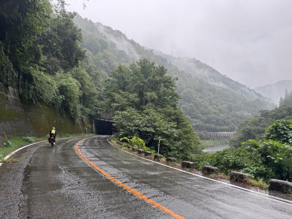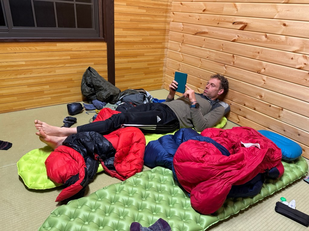 Also frühstücken, rein in die volle Regenmontur und los geht’s. Es tropft satt und beständig vor sich hin aber ist immerhin noch warm. Unser Weg führt ein grünes Flusstal entlang, wieder gibt es wenig Autos und Affen sitzen am Wegrand. Auf einer schnellen Abfahrt kreuzt plötzlich ein kleiner Bär vor uns die Straße, wir schalten die Kette nach rechts und geben Stoff. Dann fahren wir zum ersten Mal auf einer etwas stärker befahrenen Straße und sind wieder mal beeindruckt von der gigantischen Infrastruktur. Brücken, Galerien, breite Straßen, Staudämme und überall wird gebaut. Wir machen Rast in einer Kleinstadt wo wir Camping Gas nachkaufen und die vielleicht beste Pizza Japans essen. Wir scheinen einen sehr bedürftigen Eindruck zu machen, denn in beiden Fällen bekommen wir Wegzehrung geschenkt, nachdem wir sagen, dass wir nach Tokio radeln. Die letzten Kilometer geht es dann nochmal bergauf zum Skiresort Hirugano, womit wir auch wieder auf unserer ursprünglich geplanten Route sind. Die Gegend ist hier deutlich belebter. Wir hoffen also wieder auf einen geöffneten Campingplatz und diesmal, in der dritten Nacht, haben wir Glück! Nach dem wir vom beständigen Regen komplett durchnässt sind und es hier oben auf 870m deutlich kühler ist, mieten wir uns sogar in eine kleine Hütte auf dem Platz ein.